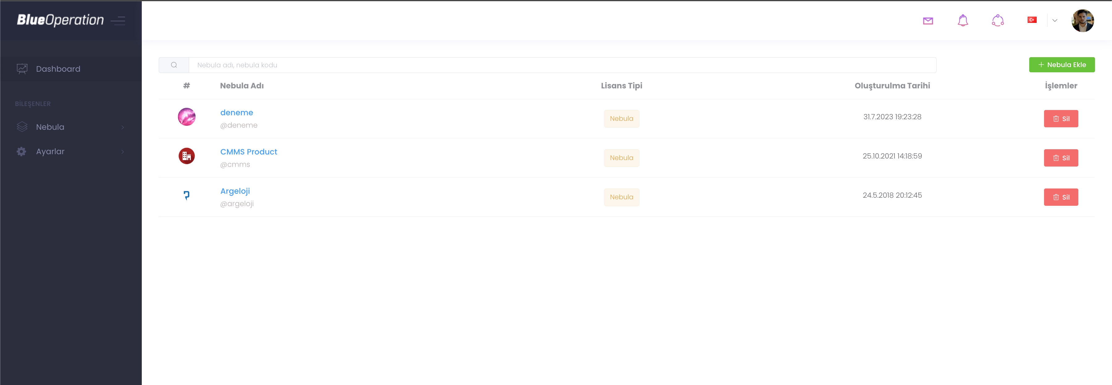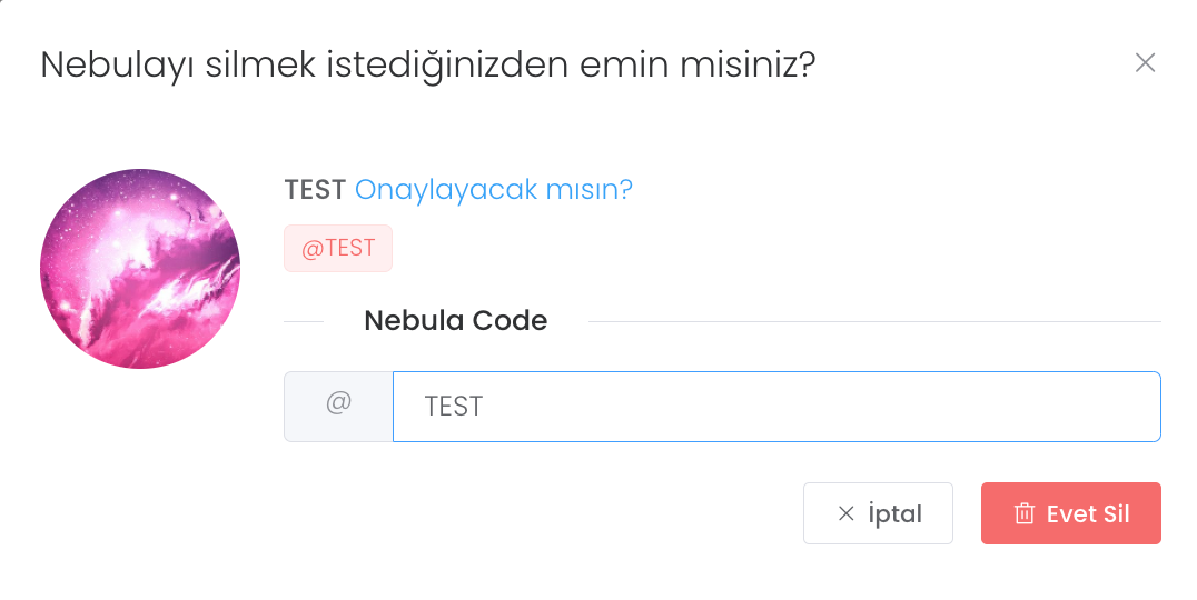 Nebula silme işleminde silmek istediğiniz nebulayı panelin üzerinden veya profil kısmından "Sil" butonuna tıkladıktan sonra doğru nebula kodunu girerek silebilirsiniz . Unutmayın bu işlem sizin tarafınızdan geri alınamaz.