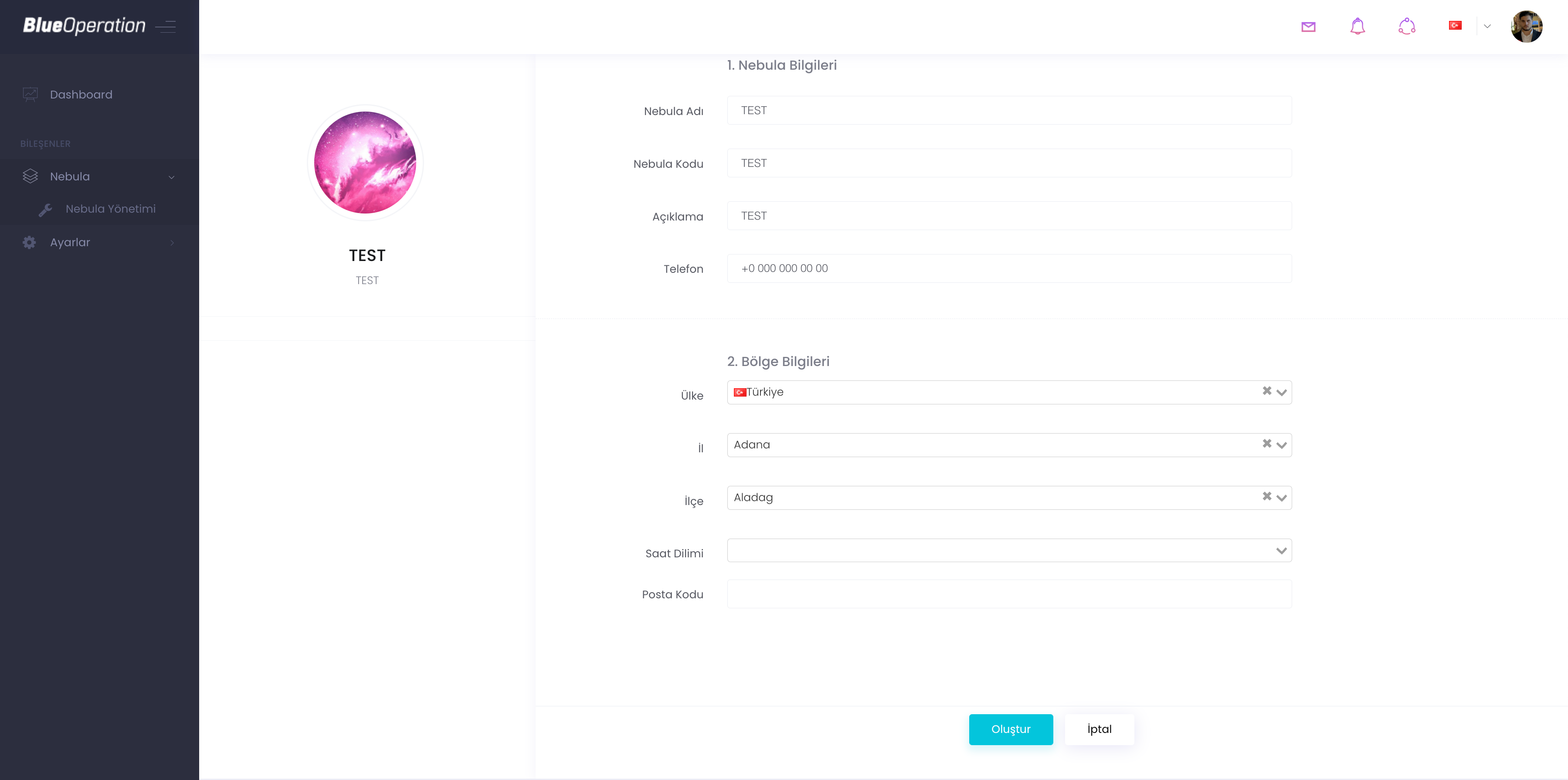 "Nebula ekle" kısmına tıkladığınızda sizi bu sayfa karşılayacaktır. Bu sayfada Nebulanıza istediğiniz logo, isim, nebula kodu, açıklama gibi parametreler tanımlanır. Vereceğiniz nebula kodu akılda kalıcı olmalıdır . Nebula içi belirli işlemlerde ve nebulanızı silmeniz dahilinde sizden “Nebula Kodu”isteyecektir.