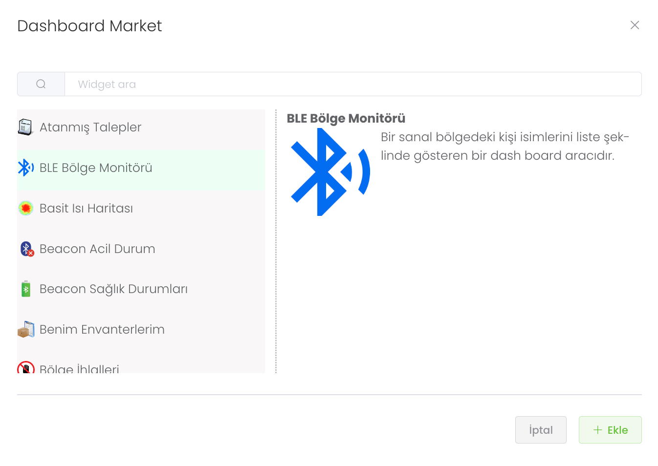 Dashboard Market kısmında 10 adetten fazla size yardımcı ve işlerinizi kolaylaştıran analizlerinizi kolaylaştıran widgetları, üstüne tıkladığınız ve görevini okuduğunuz widget sizin çalışma alanınıza uygunsa "Ekle" butonuna tıklayarak widgeti kendi panelinize entegre edebilirsiniz.