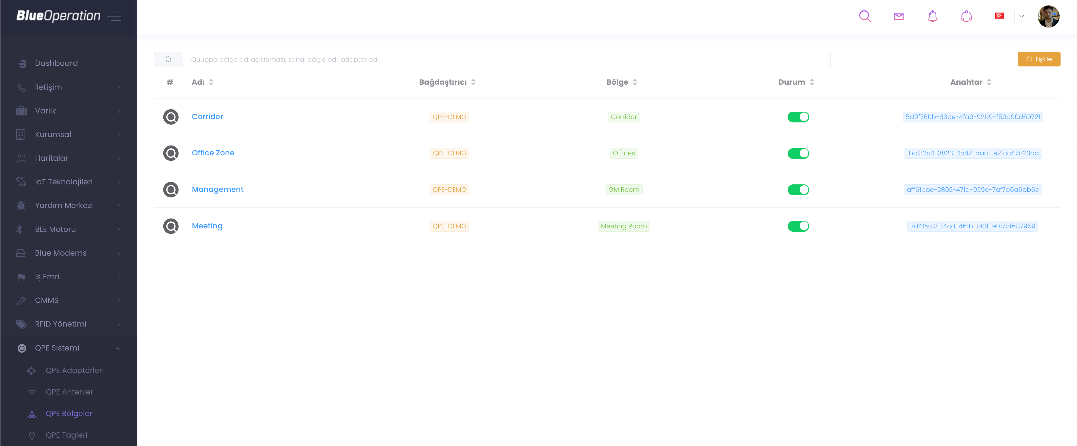 Bu yazılımın bölgeler bölümünü yönetmek için kullandığımız panel "QPE Bölgeler" panelidir. Bu panelde kayıtlı bölgeleri yönetebilir, diğer bölgelerle eşitleyebilir.