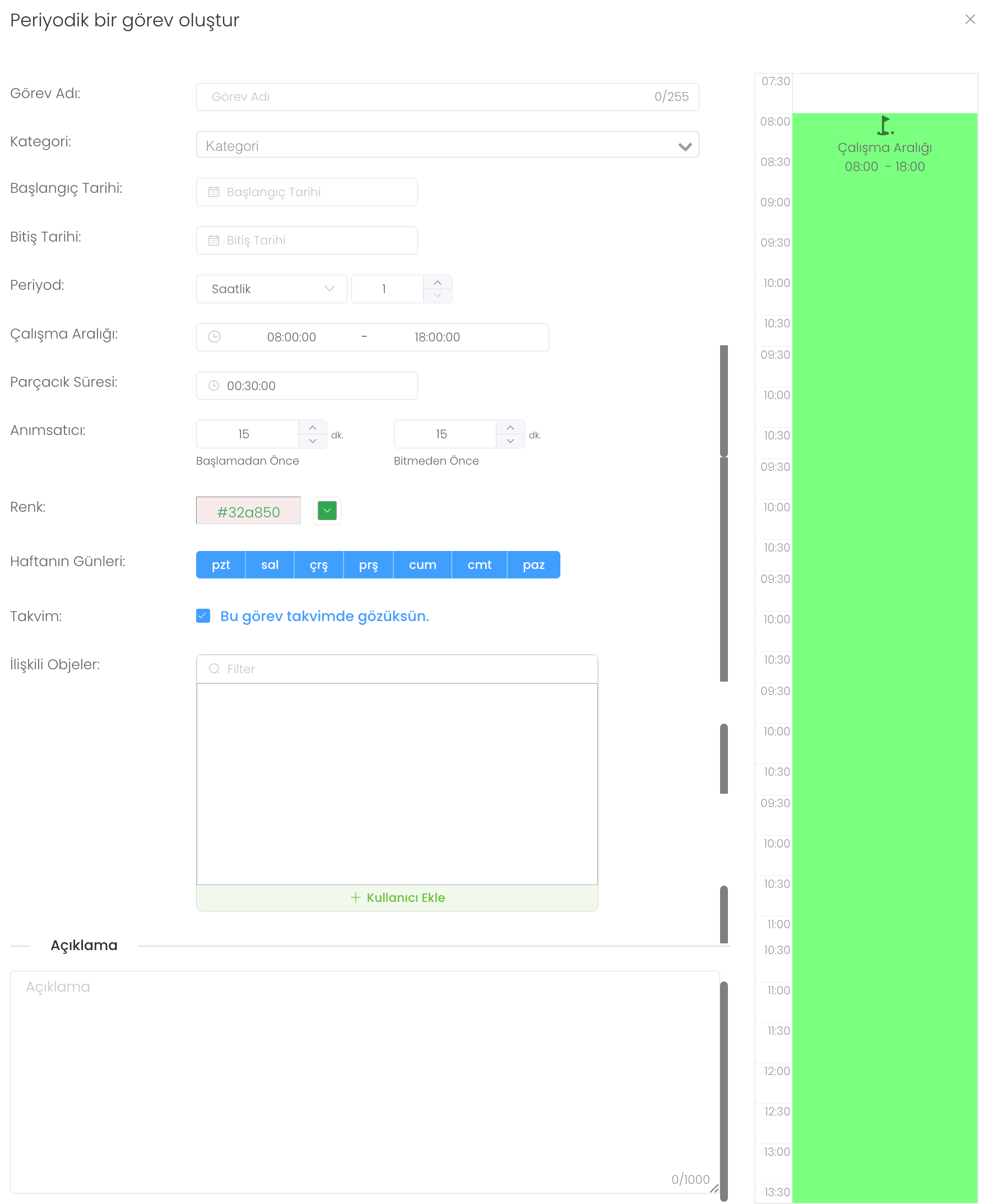 “Oluştur” butonuna tıkladığınızda "Genel" bölümünde Periyodik bir görev oluşturmanız için karşınıza detaylı bir yapı gelmektedir. Gerekli bilgileri doldurup sağ tarafta bulunan çalışma aralığı alanını sürükleyerek ayarlayabilirsiniz.