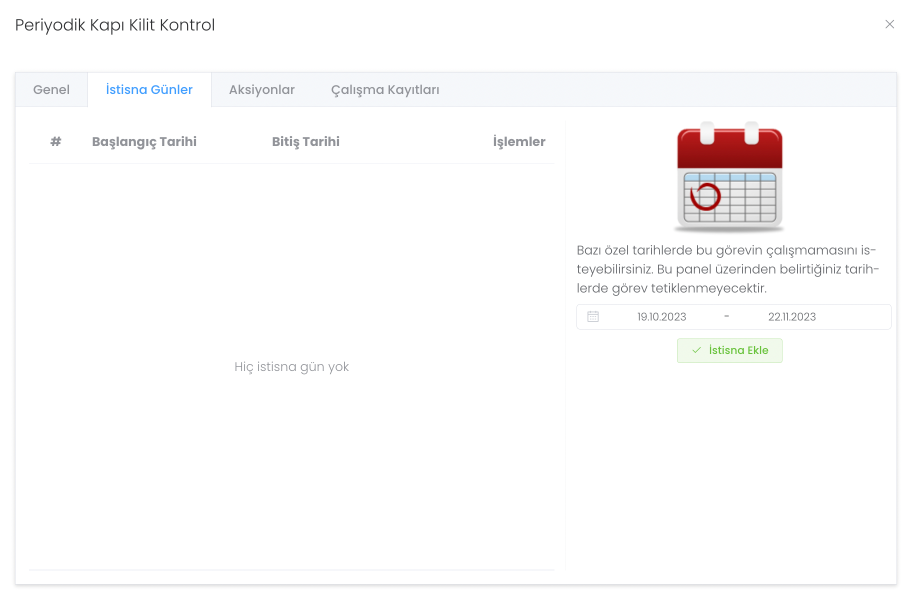 İstisna günler bölümünde belirlenen olayın kontrol dışı tutulacağı zamanları belirleyip yöneteceğiniz yapıdır.