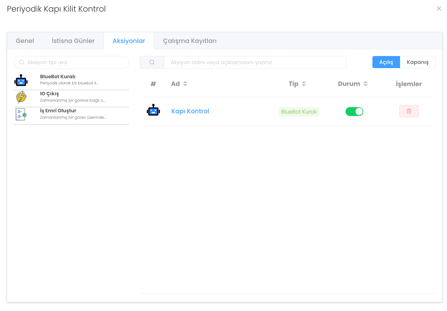 Aksiyonlar bölümünde BlueBot Kuralı, IO Çıkışı, İş Emri Oluştur olmak üzere 3 adet aksiyon tipi bulunmaktadır. Ayrıca sağ tarafta bulunan Açılış ve Kapanış bölümlerinden emirlerinizi kategorize etmiş olursunuz.
