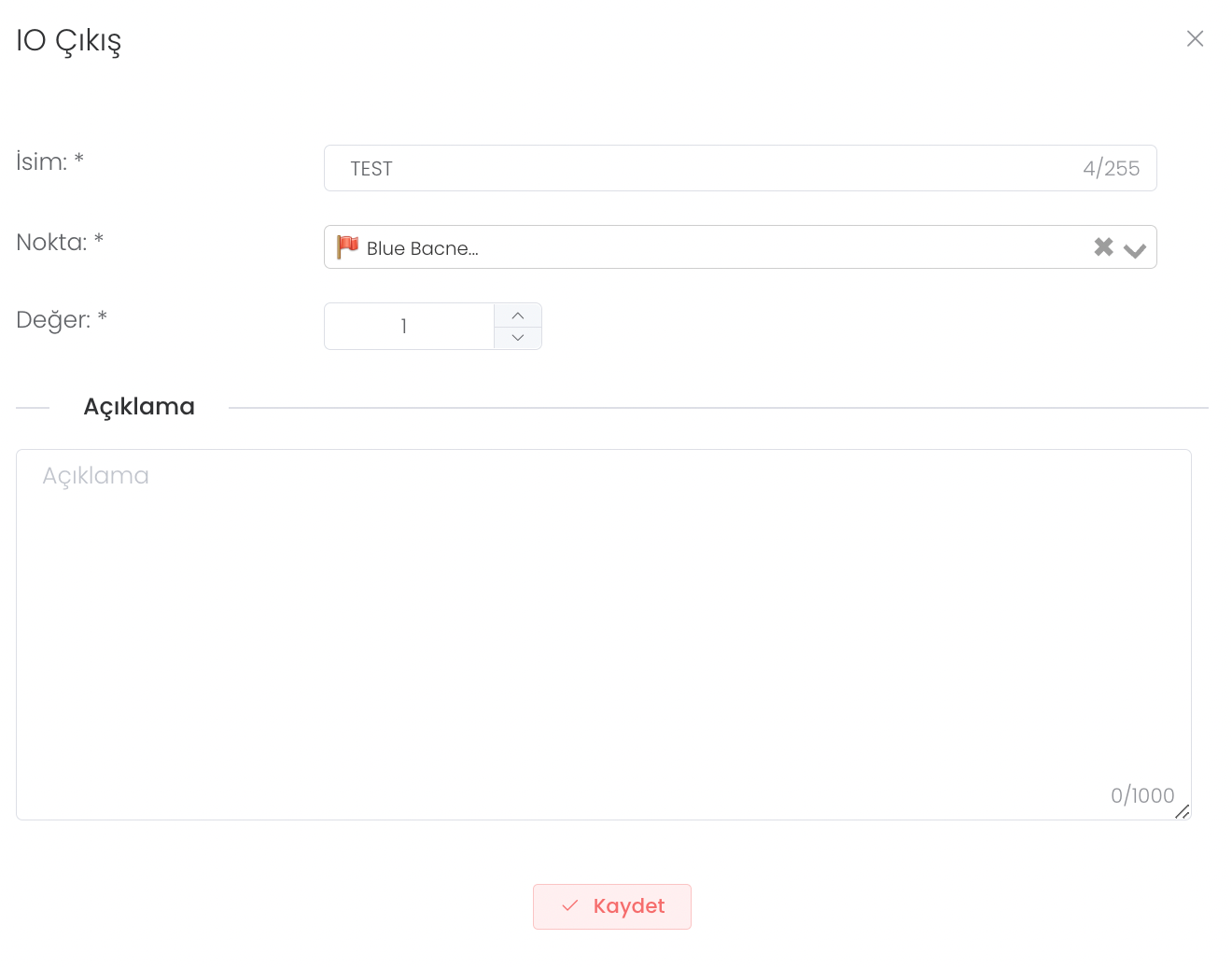 IO Çıkışı: Zamanlanmış bir göreve bağlı olarak bir elektriksel çıkış üretebilirsiniz. İsim, nokta değer bilgisi girerek bu çıkışın özelliklerini tanımlayabilirsiniz.
