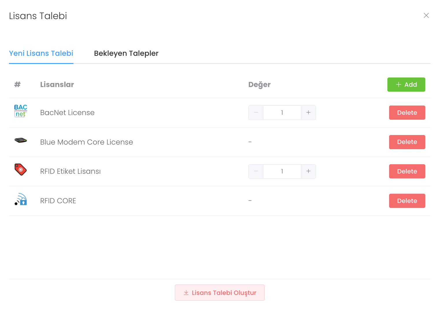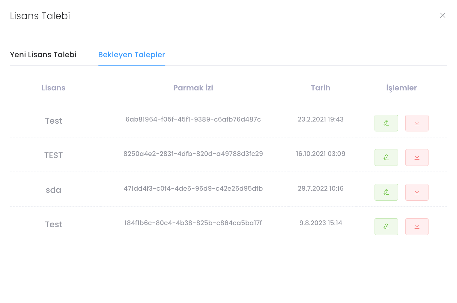 "Lisans Talebi" butonuna tıkladığınızda karşınıza lisans talebi oluşturabileceğiniz ve talepleri yönetebileceğiniz bir model açılır.