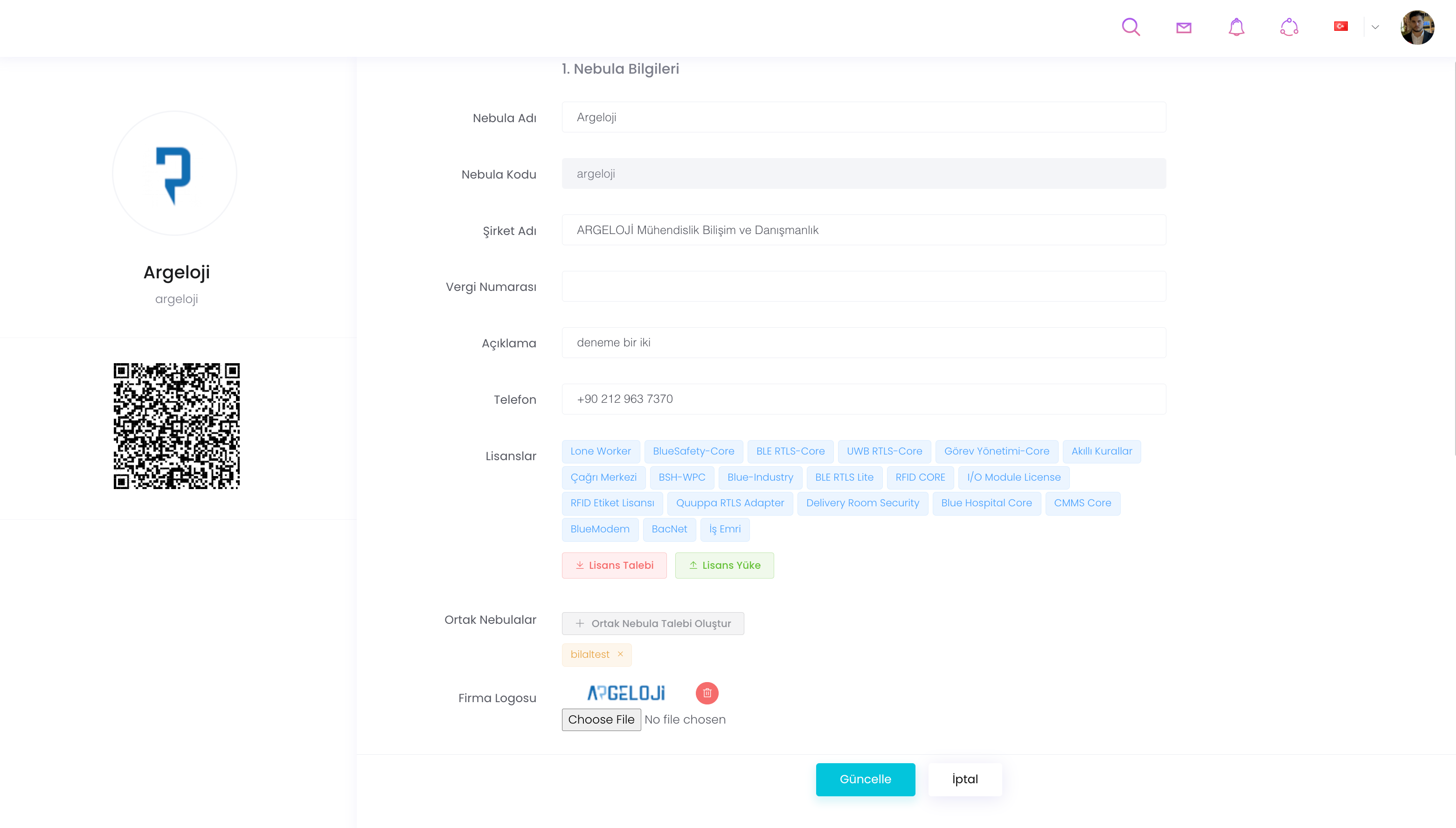 -Nebula Bilgileri : Bu bölümde nebula ad , nebula kodu, şirket adı, lisan, firma logosu , ortak nebula aracı gibi bir çok değiştirilebilir ve yönetilebilir alan bulunmaktadır.