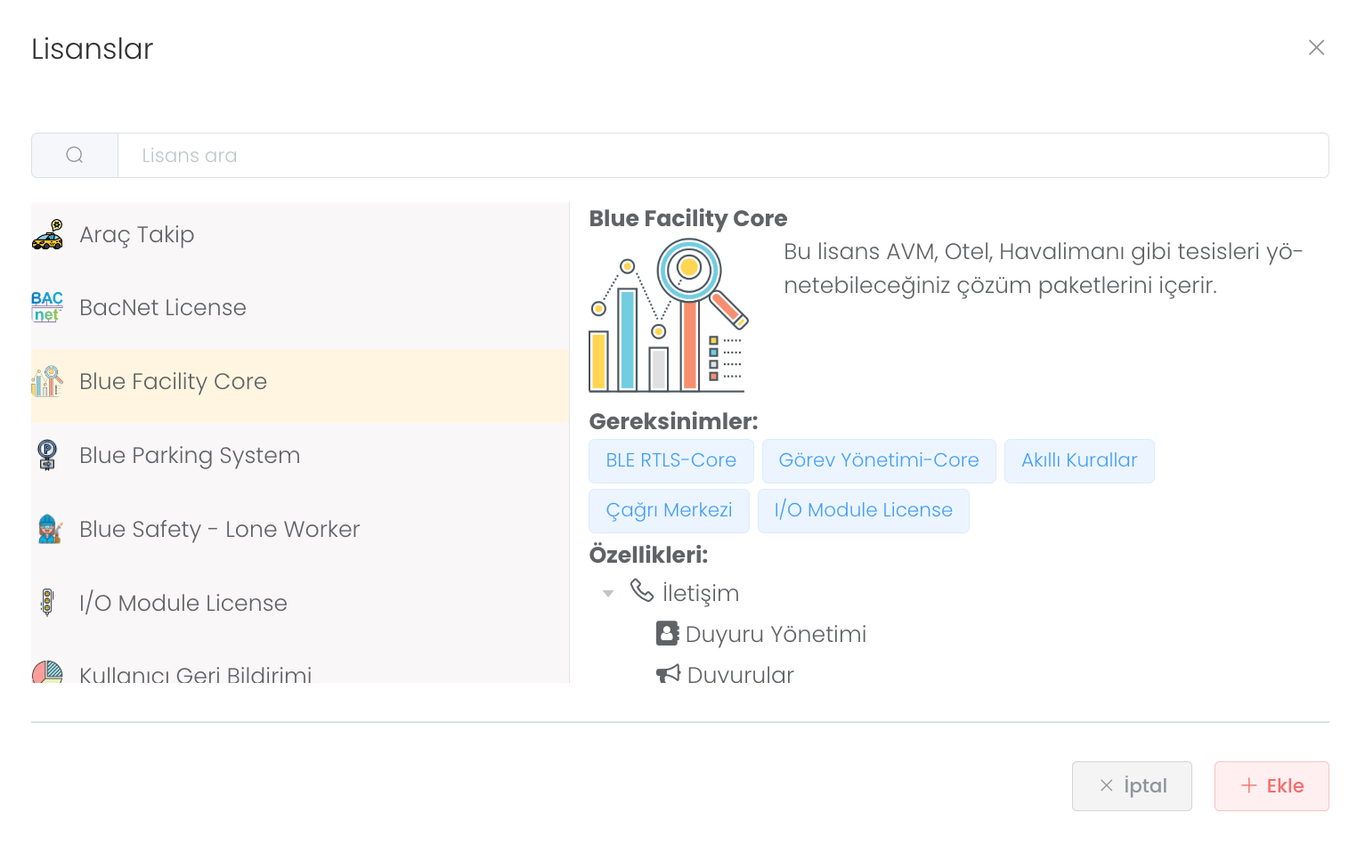 "Add" butonuna tıkladığınızda tüm lisanların ne işe yaradıkları, gereksinim ve özelliklerini okuyup "Ekle" butonu ile sepet oluşturma mantığıyla ihtiyacınız olan lisansların hepsini ekledikten sonra, "Lisans Talebi Oluştur" butonuna tıklarsanız lisans talebiniz başarıyla oluşur.