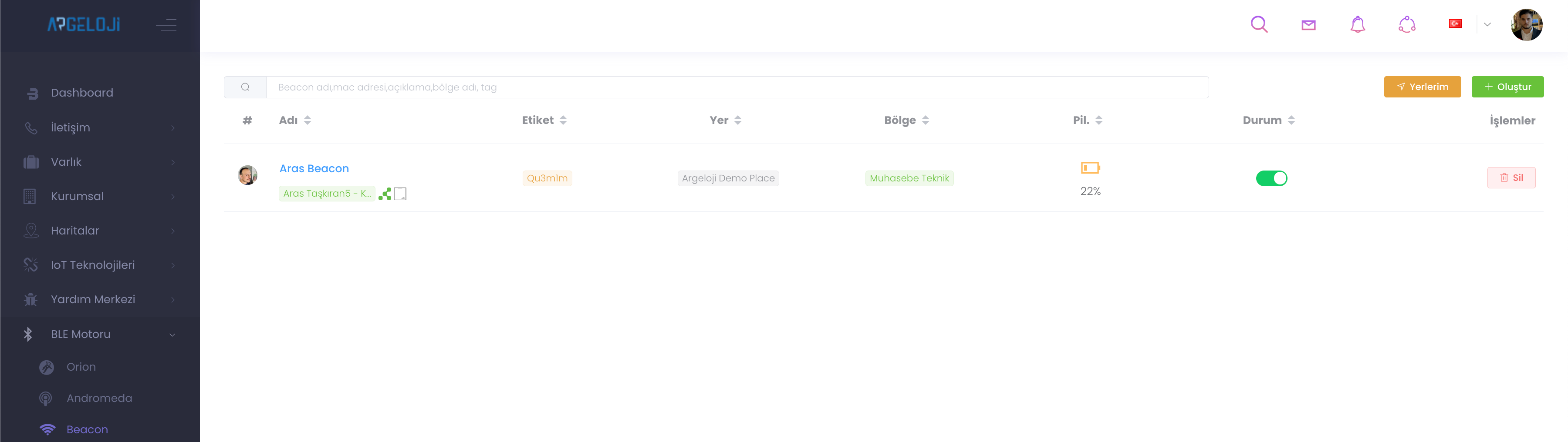 Beacon (Bluetooth Tabanlı Etkileşim Teknolojisi) düşük enerjili bluetooth teknolojisi aracılığıyla diğer akıllı cihazlara sinyal gönderen küçük kablosuz vericilerdir. Bu cihazların kime zimmetli olduğunu, yer, bölge, pil durumu, aktiflik durumu takip edip güncelleyebileceğiniz “Yerlerim” bölümünden nerelerde kullanıldığını öğrenebileceğiniz “Oluştur” butonu ile yeni bölgelere atayabileceğiniz bir yapı sunar.