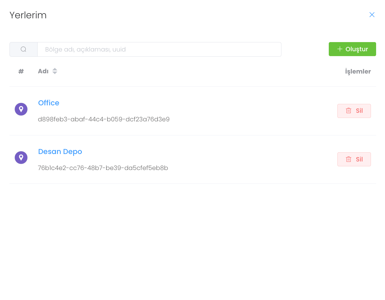 "Yerlerim" butonuna tıkladığınızda bu cihazın bulunduğu mevcut yerleri görebilir, yeni bölge oluşturabilir, mevcut bölgeleri güncelleyip silme işlemi gerçekleştirebilirsiniz.