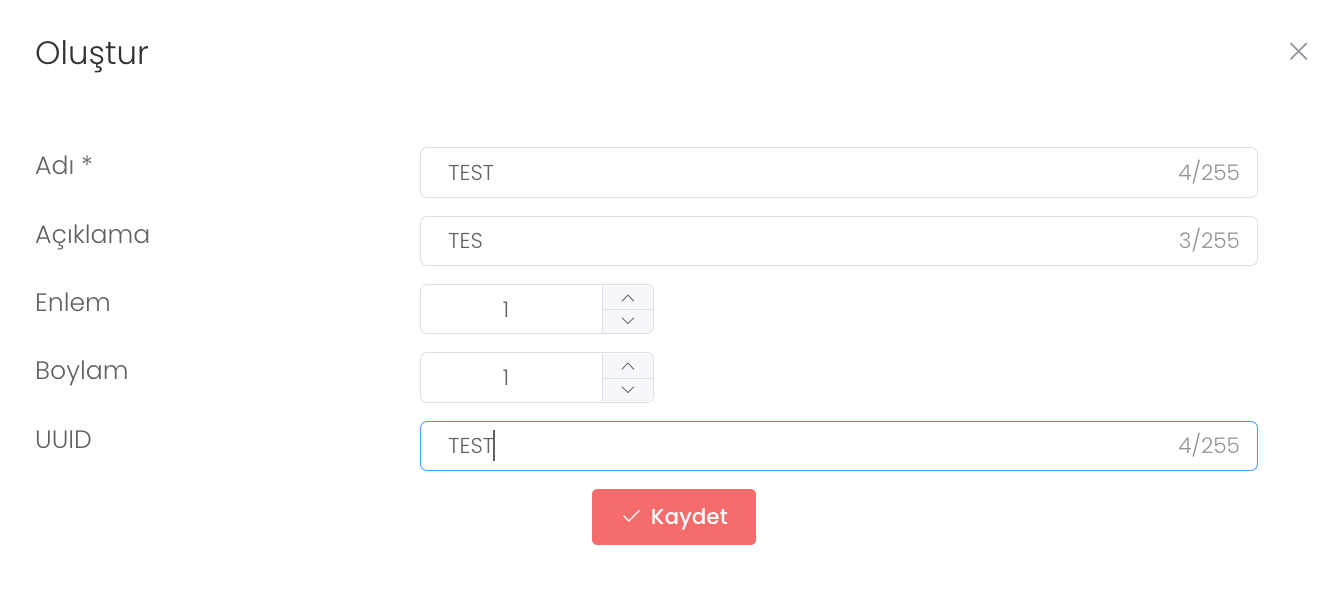 “Oluştur” butonuna basıldığında bölgenin ad, UUID, hassas değer olan enlem ve boylamını girdikten sonra “Kaydet” butonuna basarak yeni bölgenin aksiyon almasını sağlarsınız.