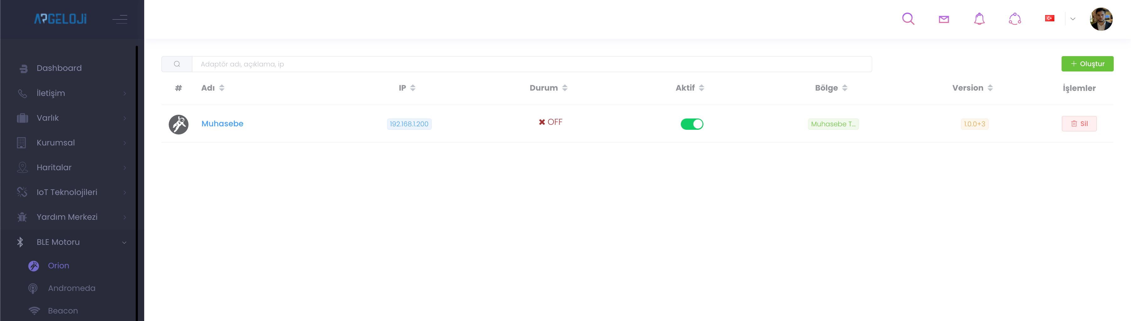 “Oluştur” butonu ile yeni bir Orion adaptörü oluşturabilirsiniz.