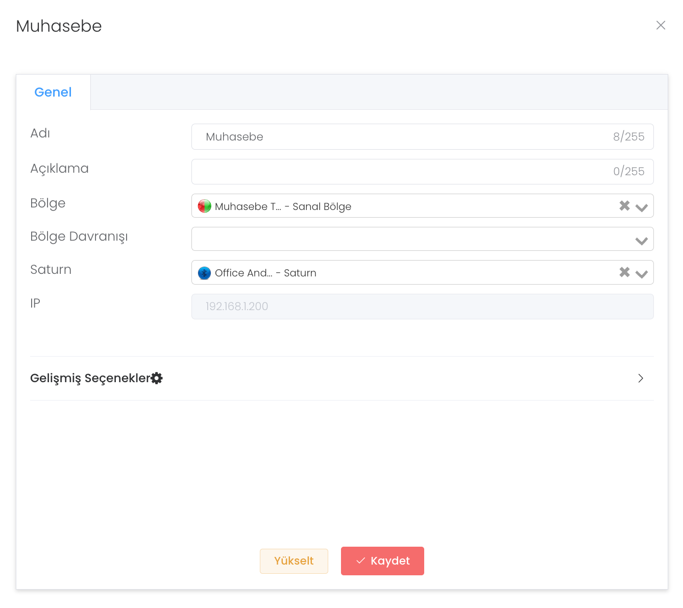 Oluşturulmuş bir adaptöre girdiğinizde sizi bu panel karşılar. Burada adaptörün ad, bölge, bölge davranışı, Satürn ve Ip gibi bilgileri gösteren ve güncelleme olanağı sunan bir yapıdır. Gelişmiş seçenekler ürün entegrasyonunda Blue Operation tarafından oluşturulan hassas ayarları içerir. Bu ayarları yetkisi olmayan biri değiştiremez sadece okuyabilir.