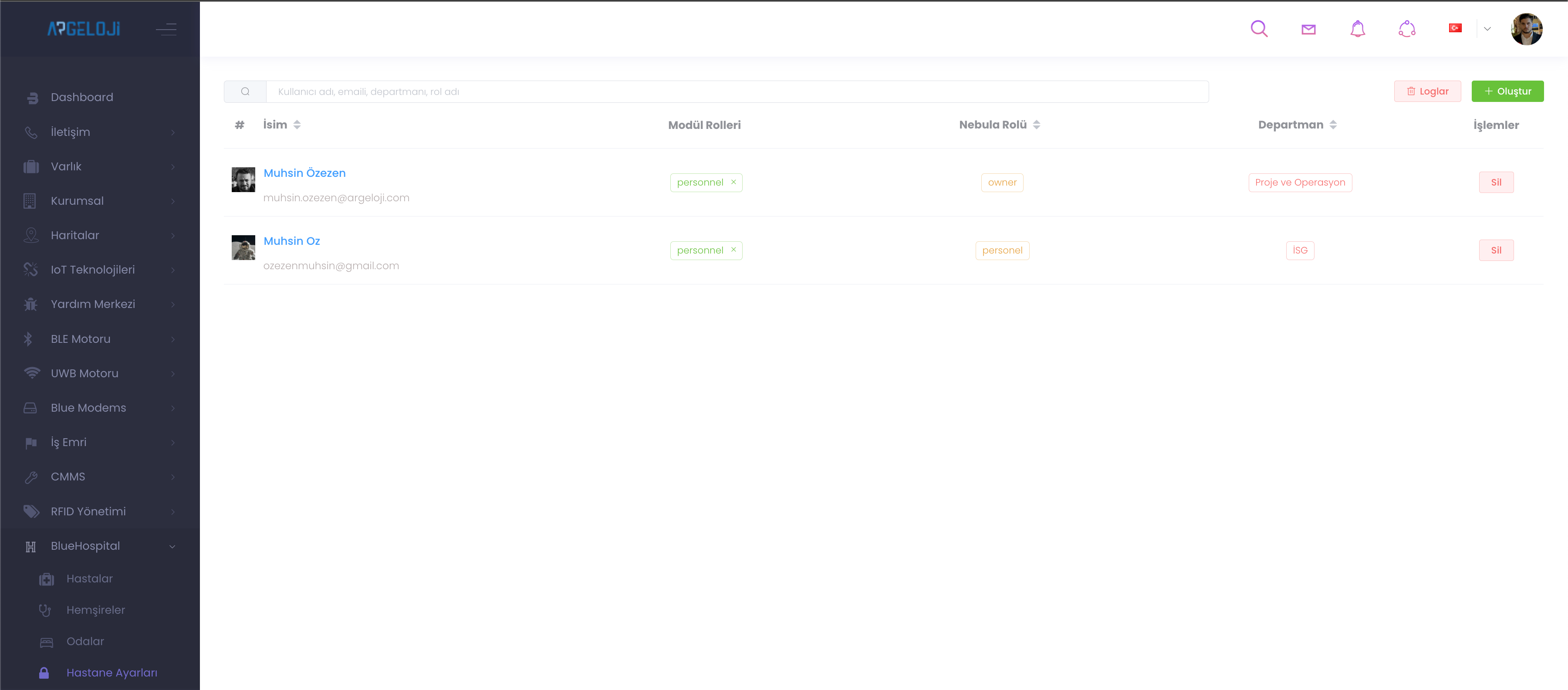 "Loglar" bölümü belirtilen tarih aralığının silindiği "Oluştur" bölümü ise yeni personel ve personelin görevinin tanımlandığı yerdir.