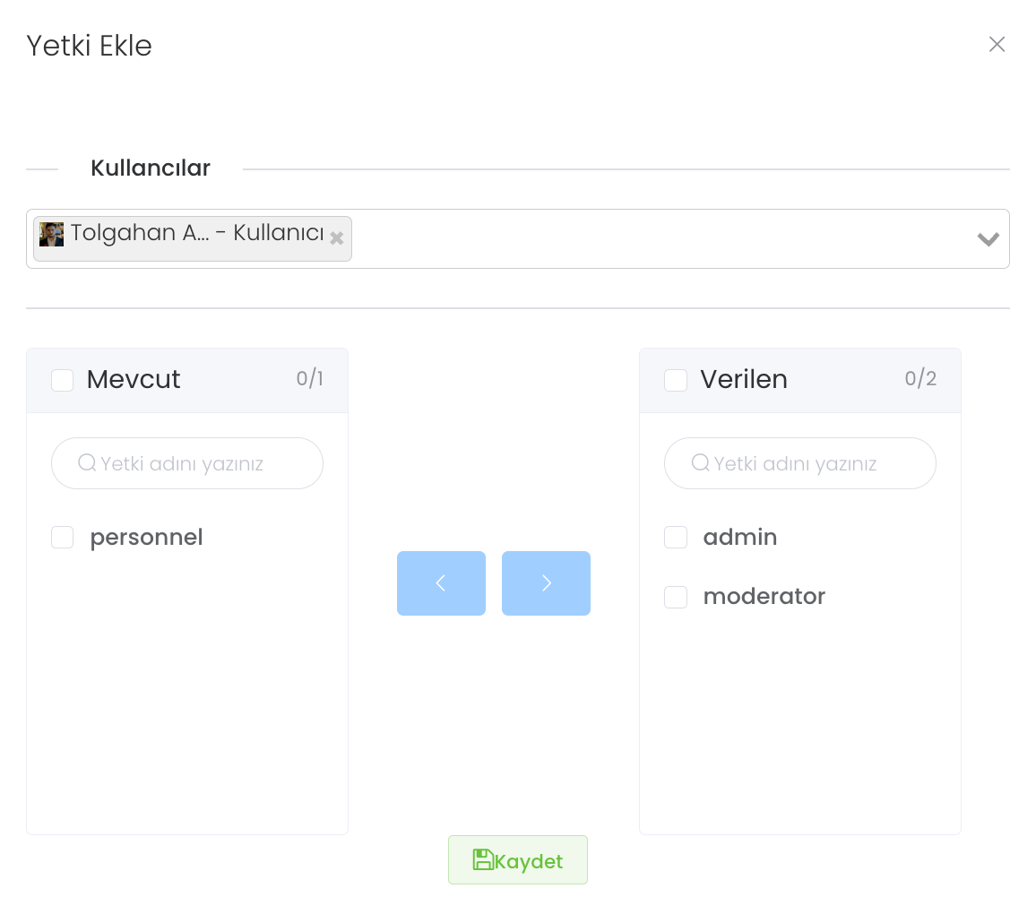 "Oluştur" butonuyla yeni kullanıcı ve yetki tanımlayabileceğiniz paneldir. "Kaydet" butonuna tıkladığınızda yeni kullanıcı ve kullanıcıya tanımlı yetkileri kaydedebilirsiniz.