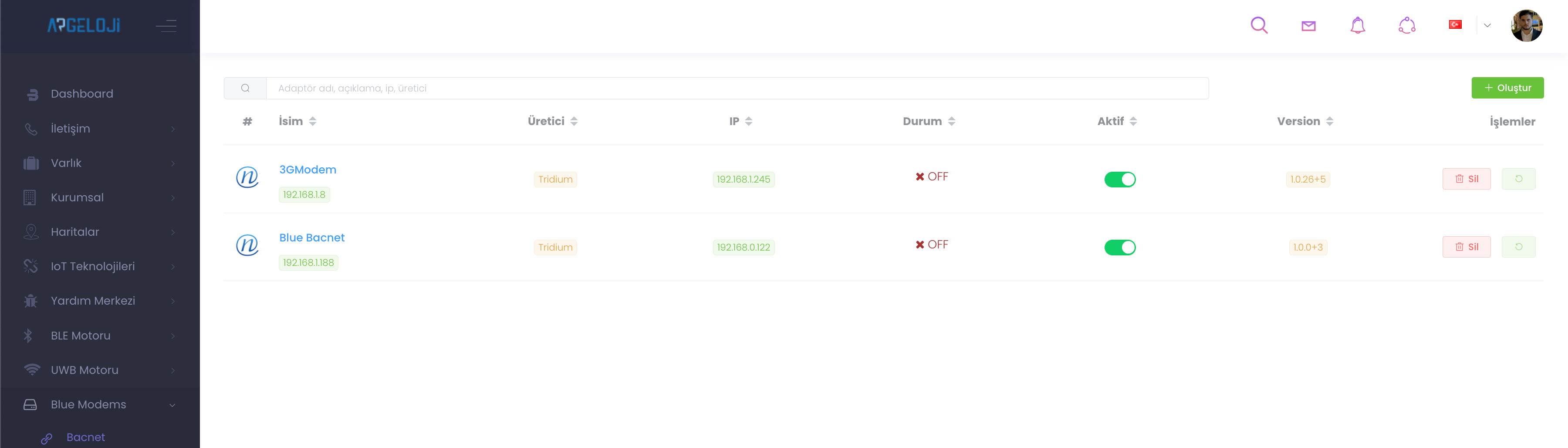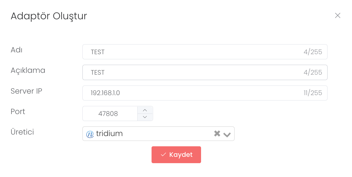 “Oluştur” butonuna tıkladığınızda ad, server ip, port ve üreticisini girip yeni bir model oluşturabilirsiniz.