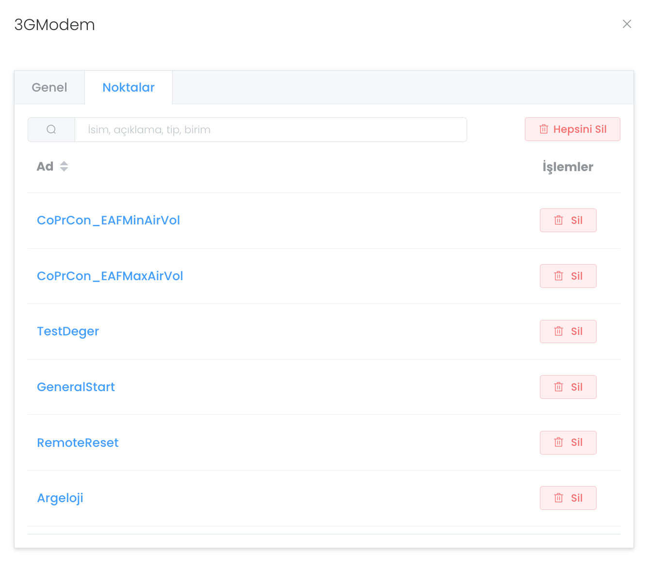 Noktalar bölümünde oluşturduğunuz cihazın tüm noktalarını ve hassas ayarlarını girebileceğiniz ve silebileceğiniz bir yapı karşılar.