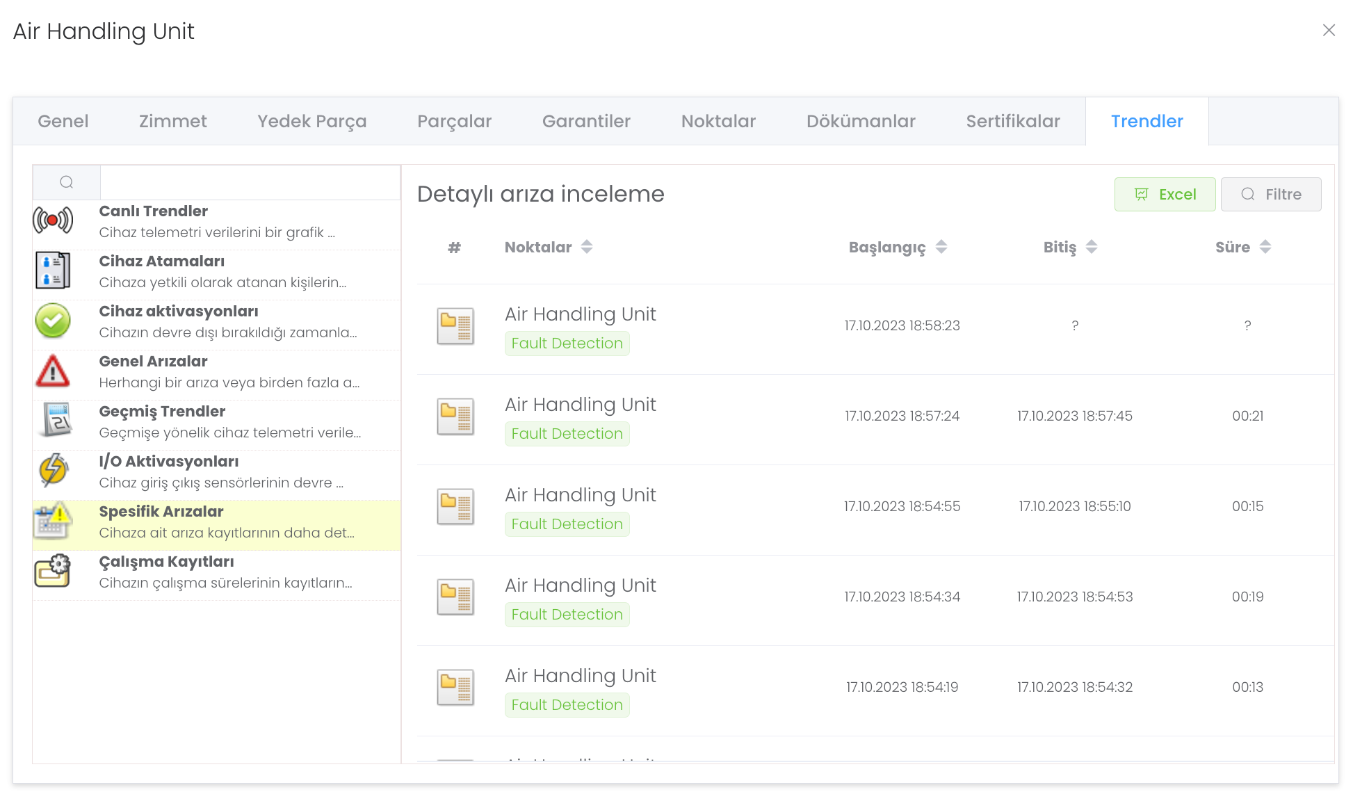 Spesifik Arızalar : Cihaza ait arıza kayıtlarının daha detaylı olarak incelemenizi sağlar. Noktaları, tarih aralığını ve süre parametresini belirttikten sonra daha detaylı aramanızı sağlar.