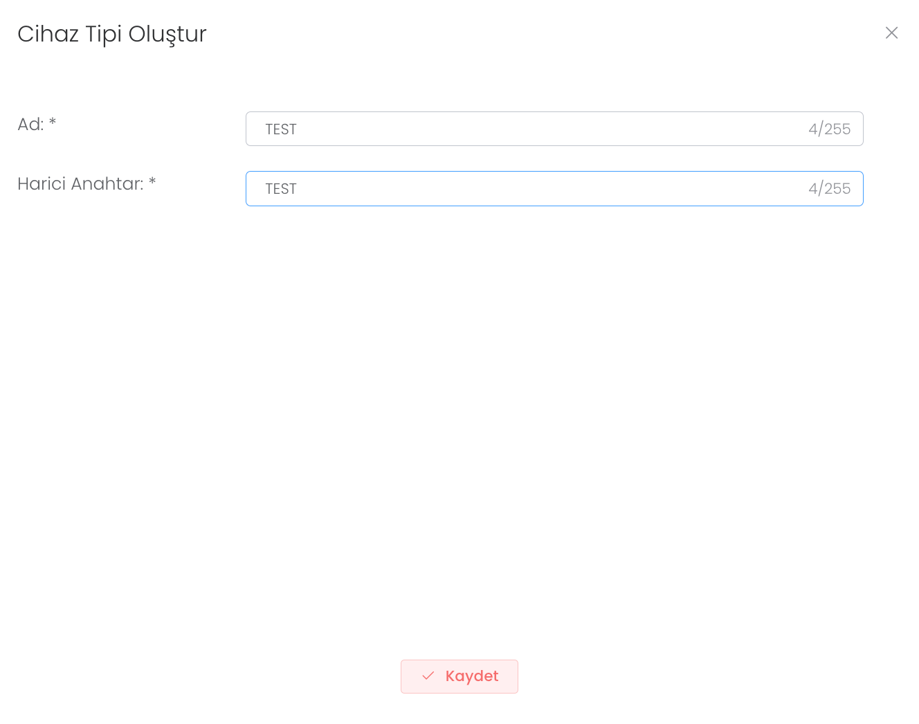 "Oluştur" butonuna bastıktan sonra ad ve harici anahtar girerek yeni bir cihaz tipi oluşturabilirsiniz.