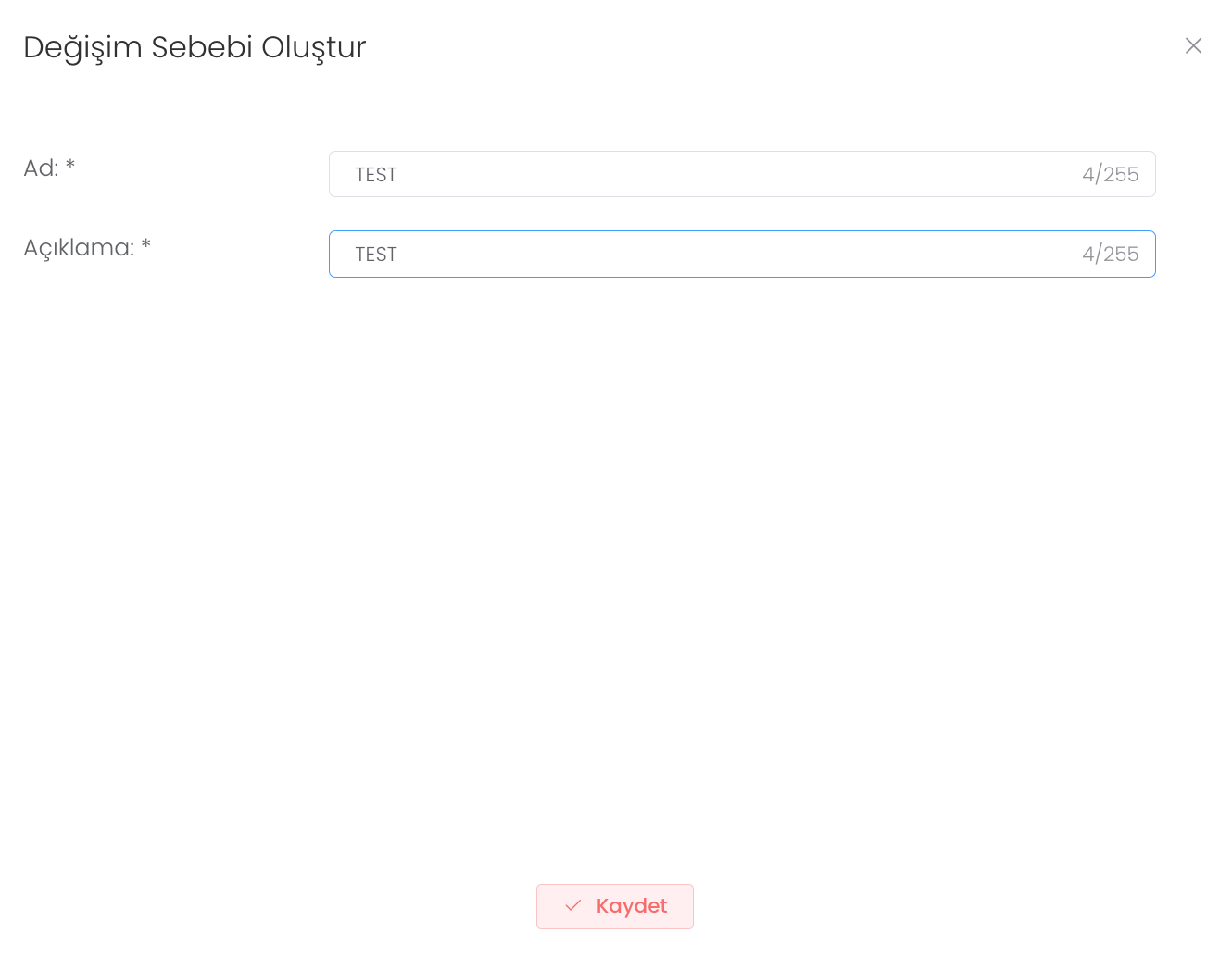 "Oluştur" butonuna bastıktan sonra ad ve açıklama girerek yeni bir değişim sebebi oluşturabilirsiniz.