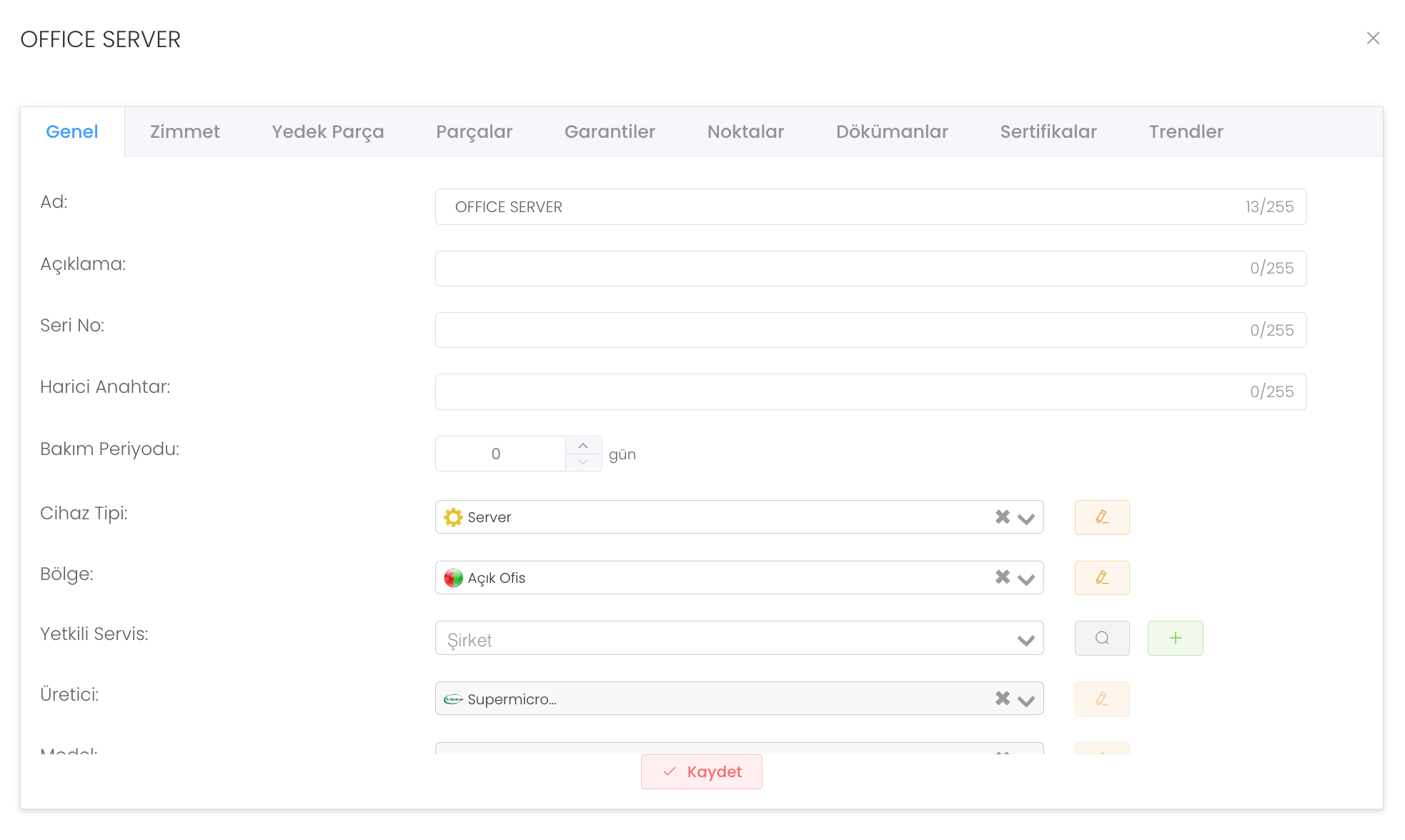 "Oluştur" butonuna bastıktan sonra ad ve açıklama, üretici, model, yaşam süresi ve minimum stok durumu girerek yeni bir cihaz yedek parçası oluşturabilirsiniz.