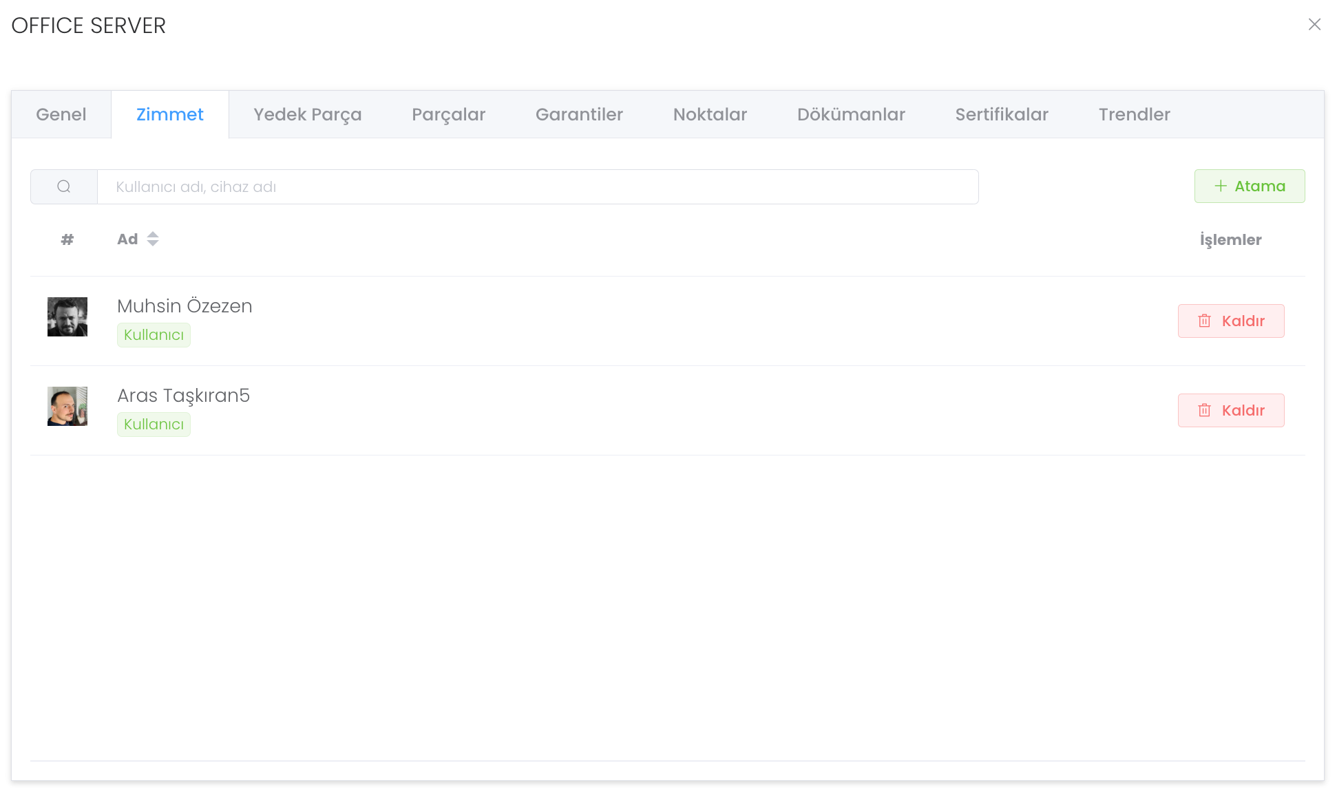 "Atama" butonuna basarak cihazı bir kullanıcıya zimmetleyebilirsiniz.