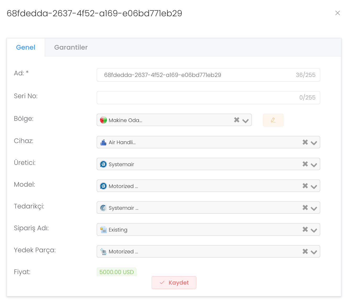 "Oluştur" butonuna bastıktan sonra ad ve açıklama, şirket, fiyat, başlangıç ve bitiş tarihi, fiyat ve garanti tipi durumu girerek yeni bir cihaz parça garantisi oluşturabilirsiniz.
