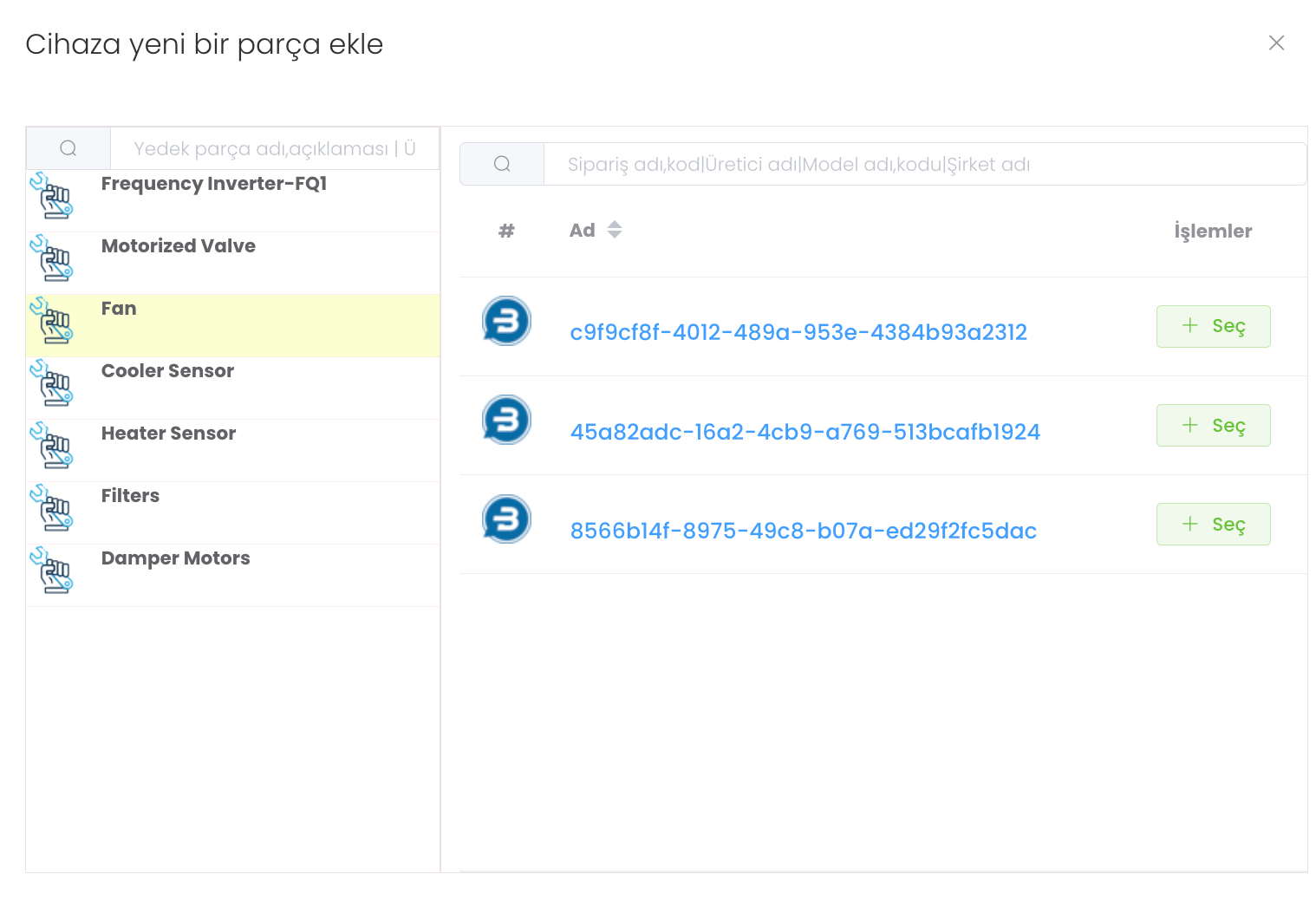 "Ekle" butonunu ile cihaza yeni bir parça eklemek istediğinizde cihazını seçtikten sonra mevcut parçaların arasından uygun olanı seçersiniz tüm işlem bukadar.