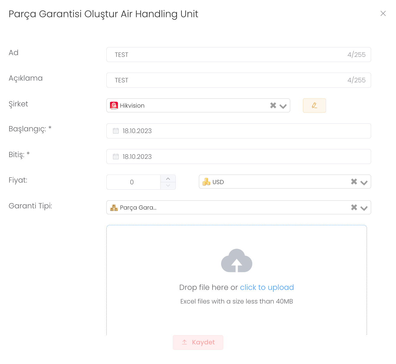 "Garanti" bölümünde iste parçaya ad, açıklama, şirket, başlangıç ve bitiş bilgilerini girdikten sonra gerekli dosyayı yükleyip bu parçanın garantisini sistemde oluşturabilirsiniz.