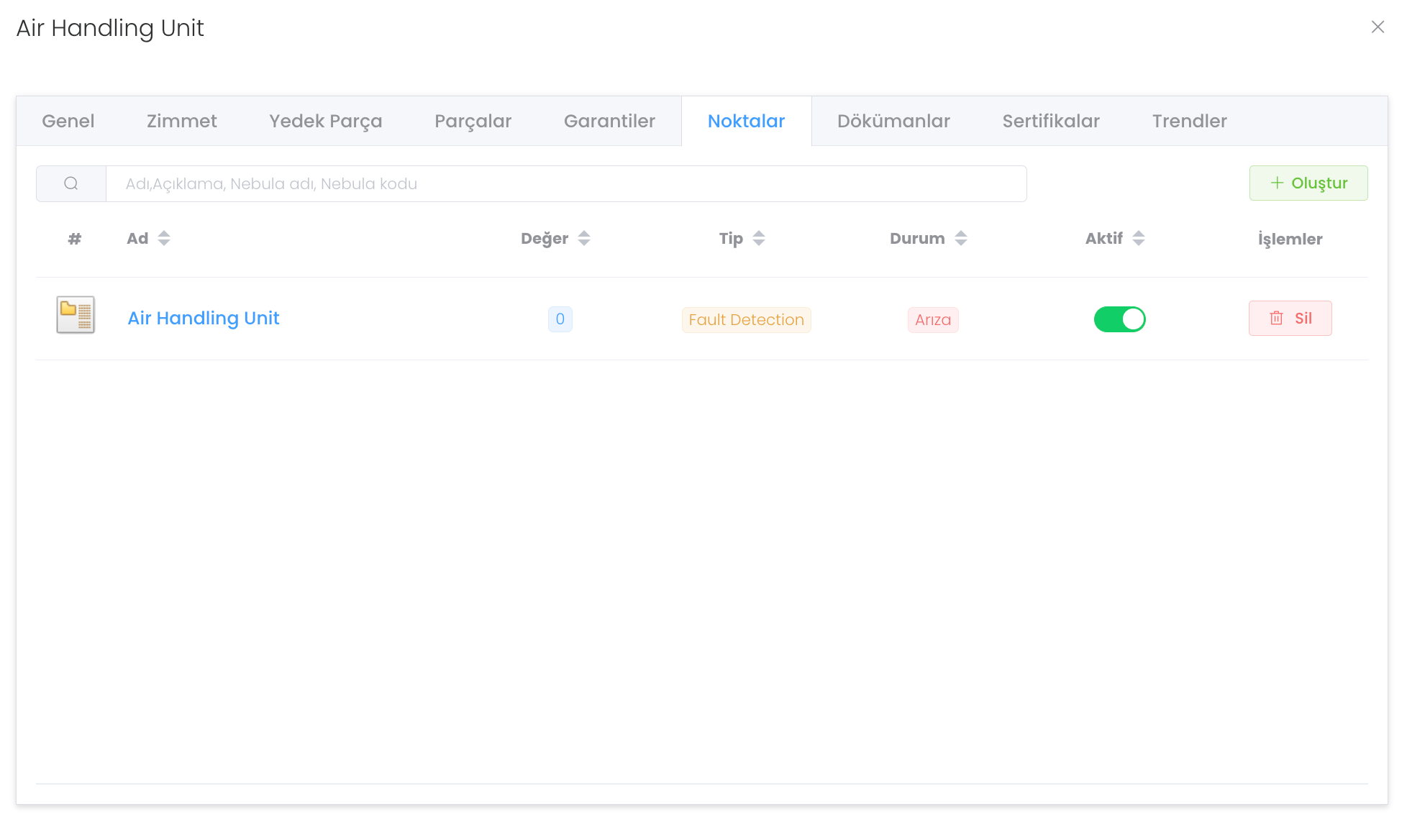 "Noktalar" bölümünde cihazın noktalarını görebileceğiniz, yönetebileceğiniz ve gerektiğinde aktifliğini kapatabileceğiniz yapıdır. "Oluştur" butonu ile yeni garanti oluşturabilirisiniz.