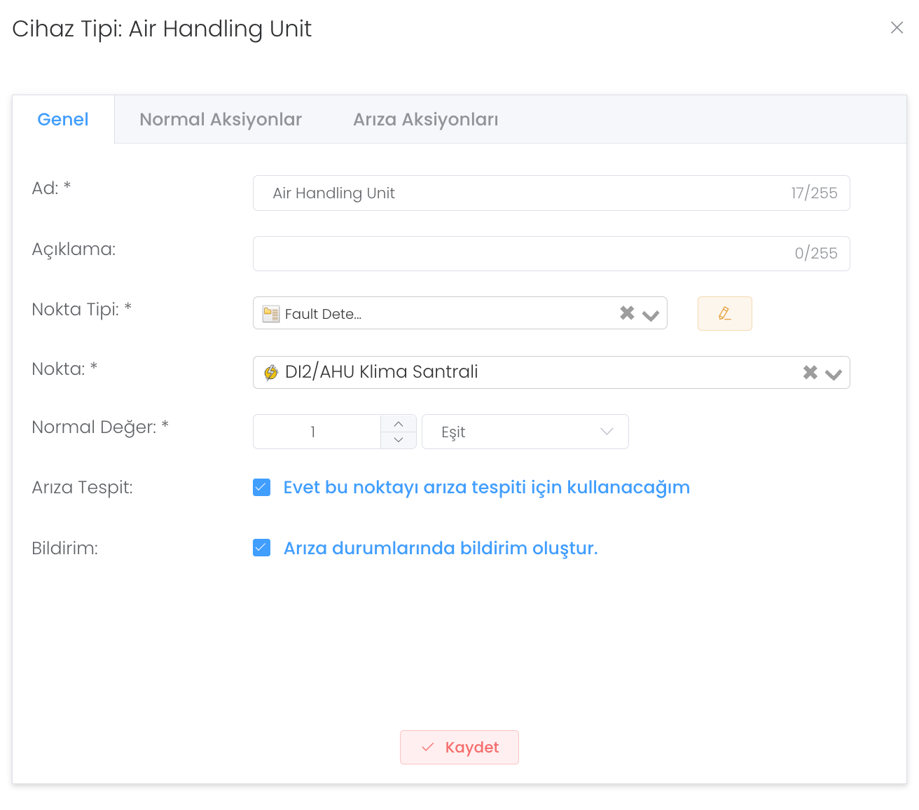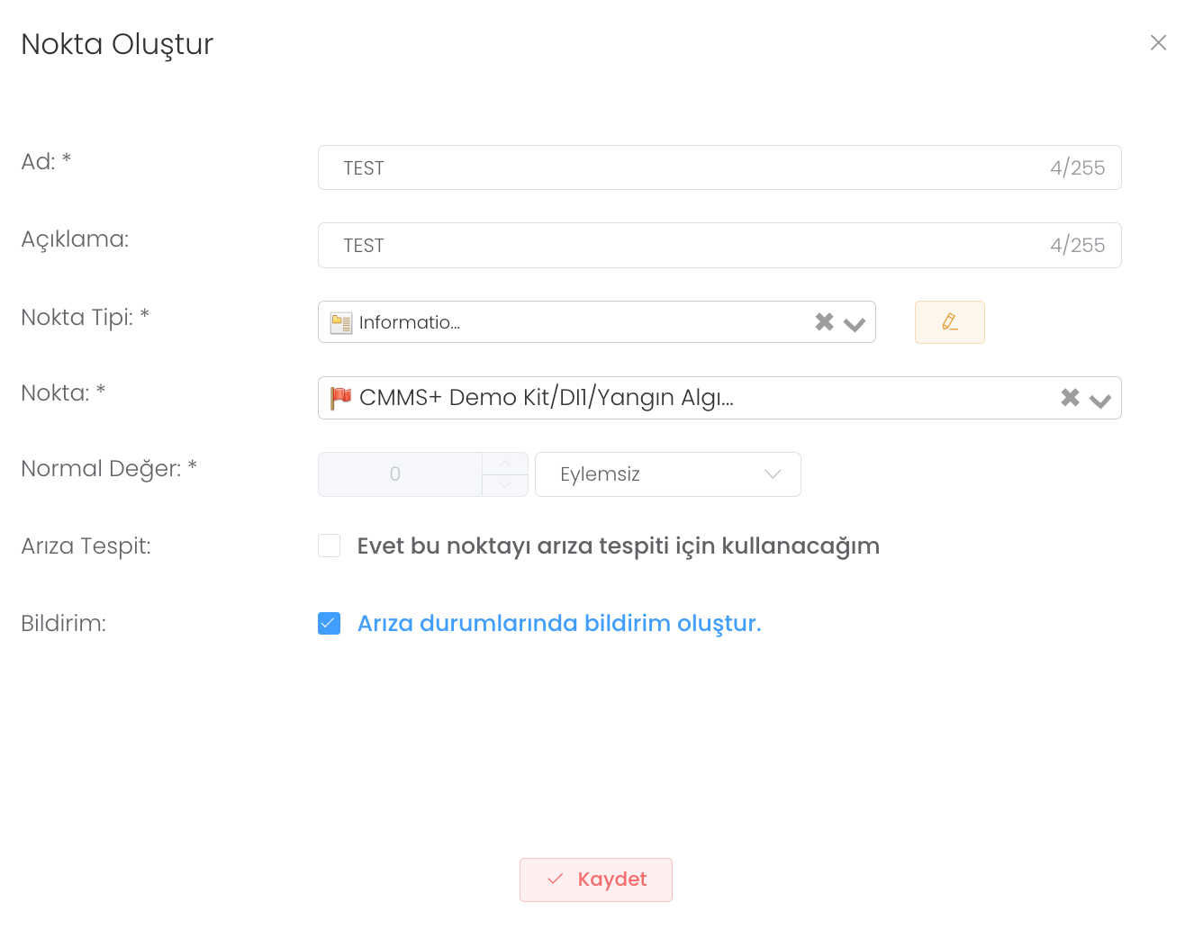 "Oluştur" butonuna bastıktan sonra ad ve açıklama, nokta tipi, nokta,normal değer, arıza tespit ve bildirim durumu girerek yeni bir cihaz noktası oluşturabilirsiniz.