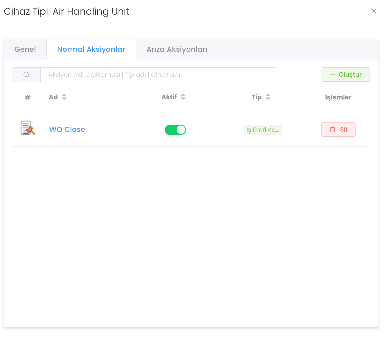 Tüm aksiyonlar bu şekilde gözükür. Aktiflik durumunu ayarlayabilir yeni bir aksiyon için "Oluştur" butonuna basabilirisiniz.