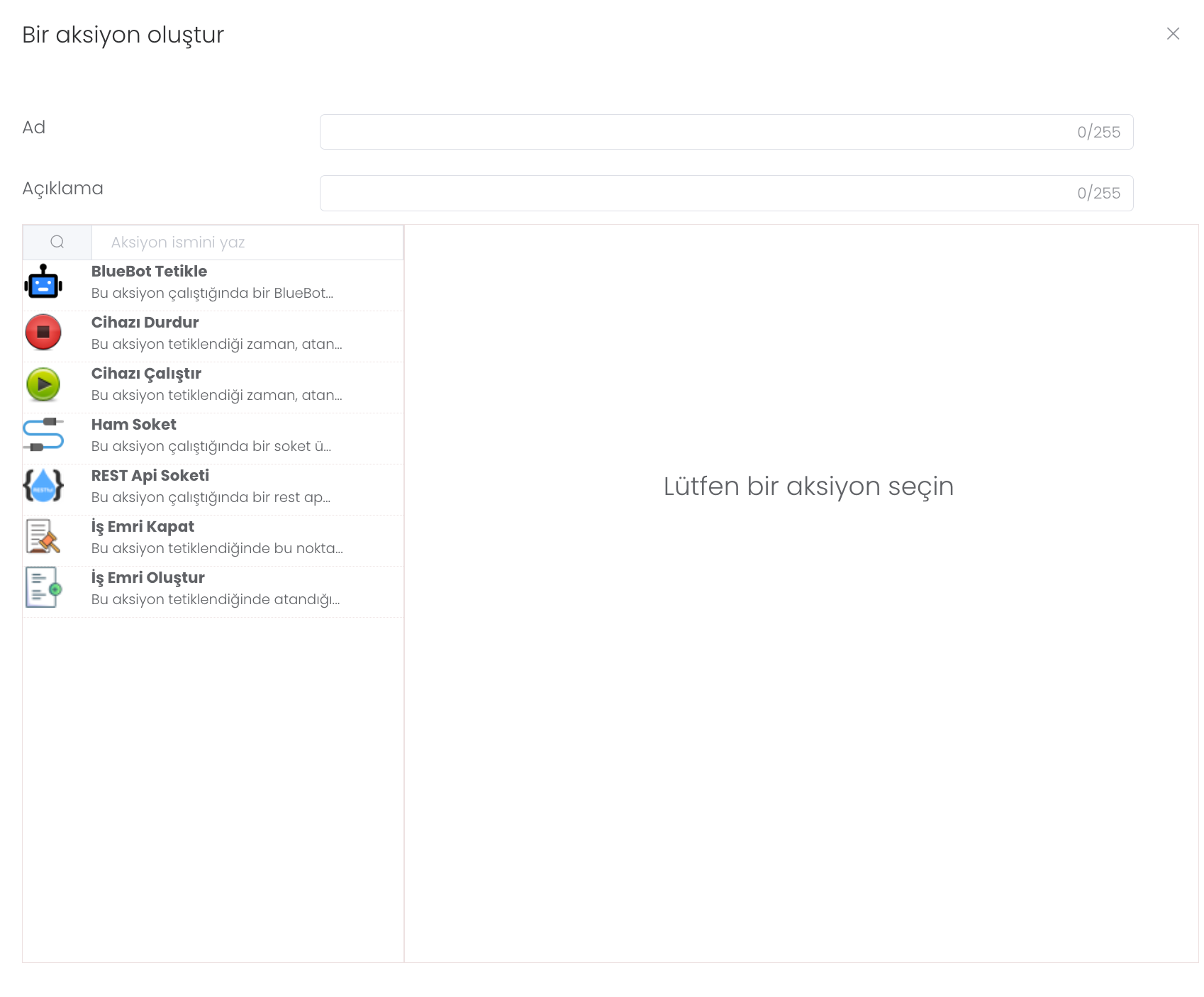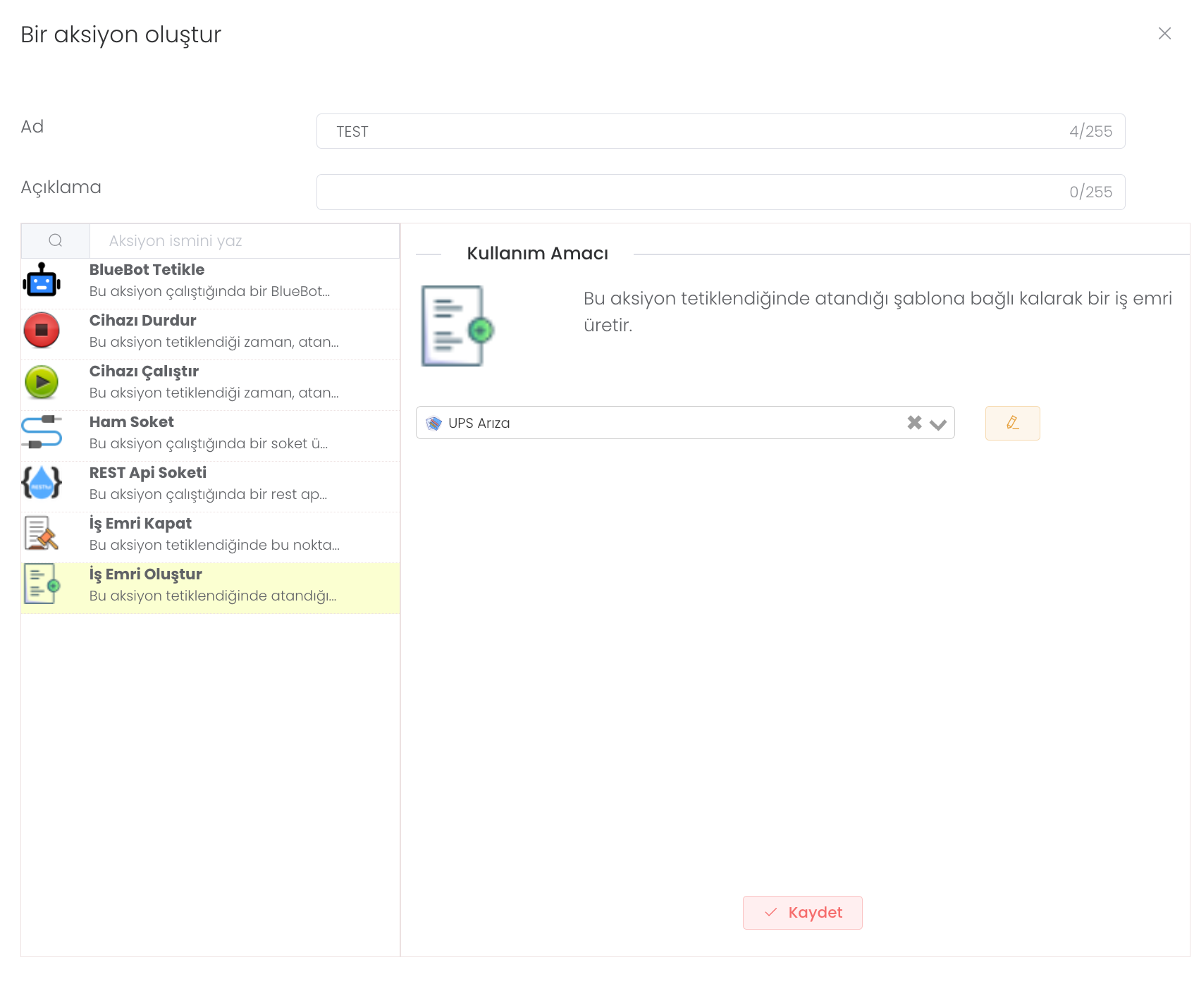 İş Emri Oluştur: Bu aksiyon tetiklendiğinde atandığı şablona bağlı kalarak bir iş emri üretir.