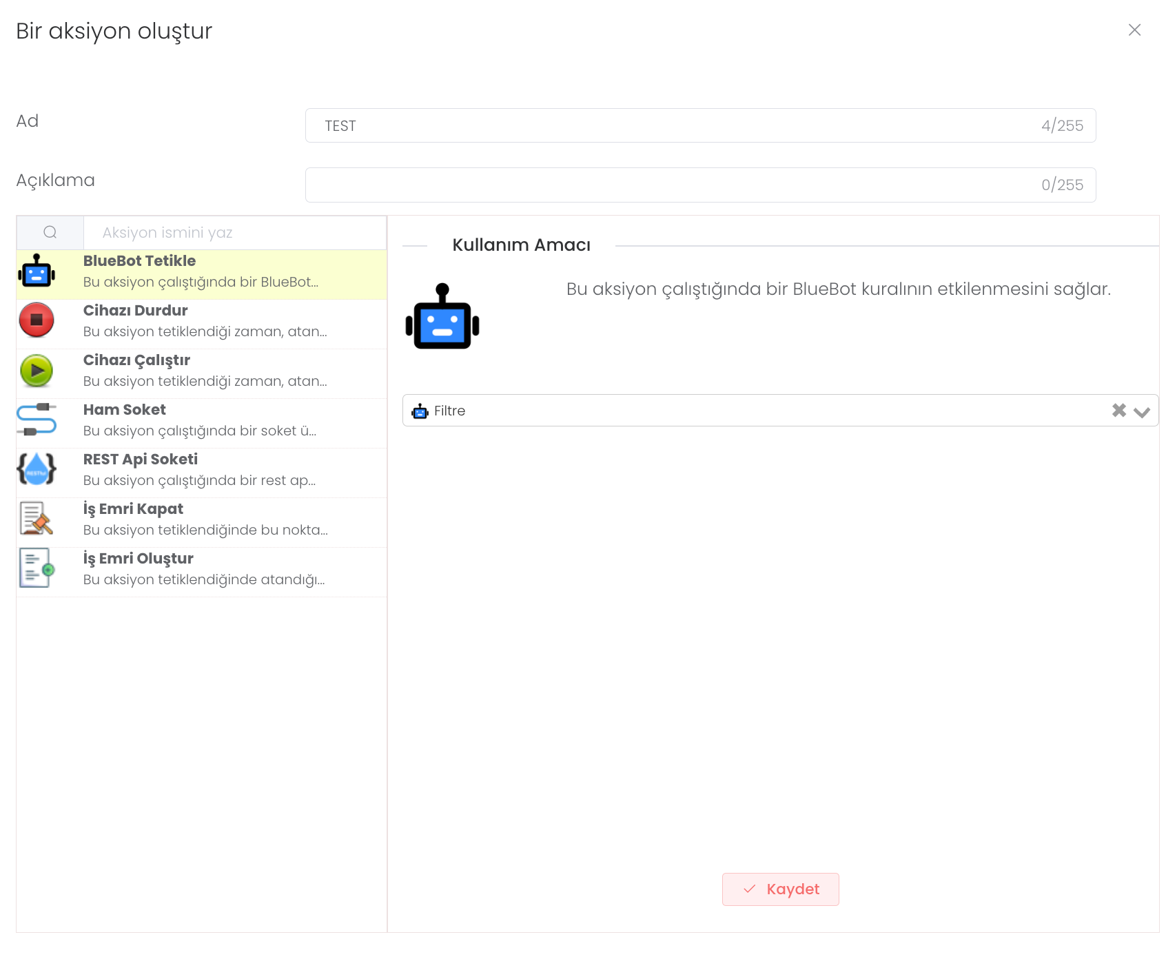 BlueBot Tetikle: Bu aksiyon çalıştığında bir BlueBot kuralının etkilenmesini sağlar. Bu kurallar BlueBot tarafında önceden belirlenir.