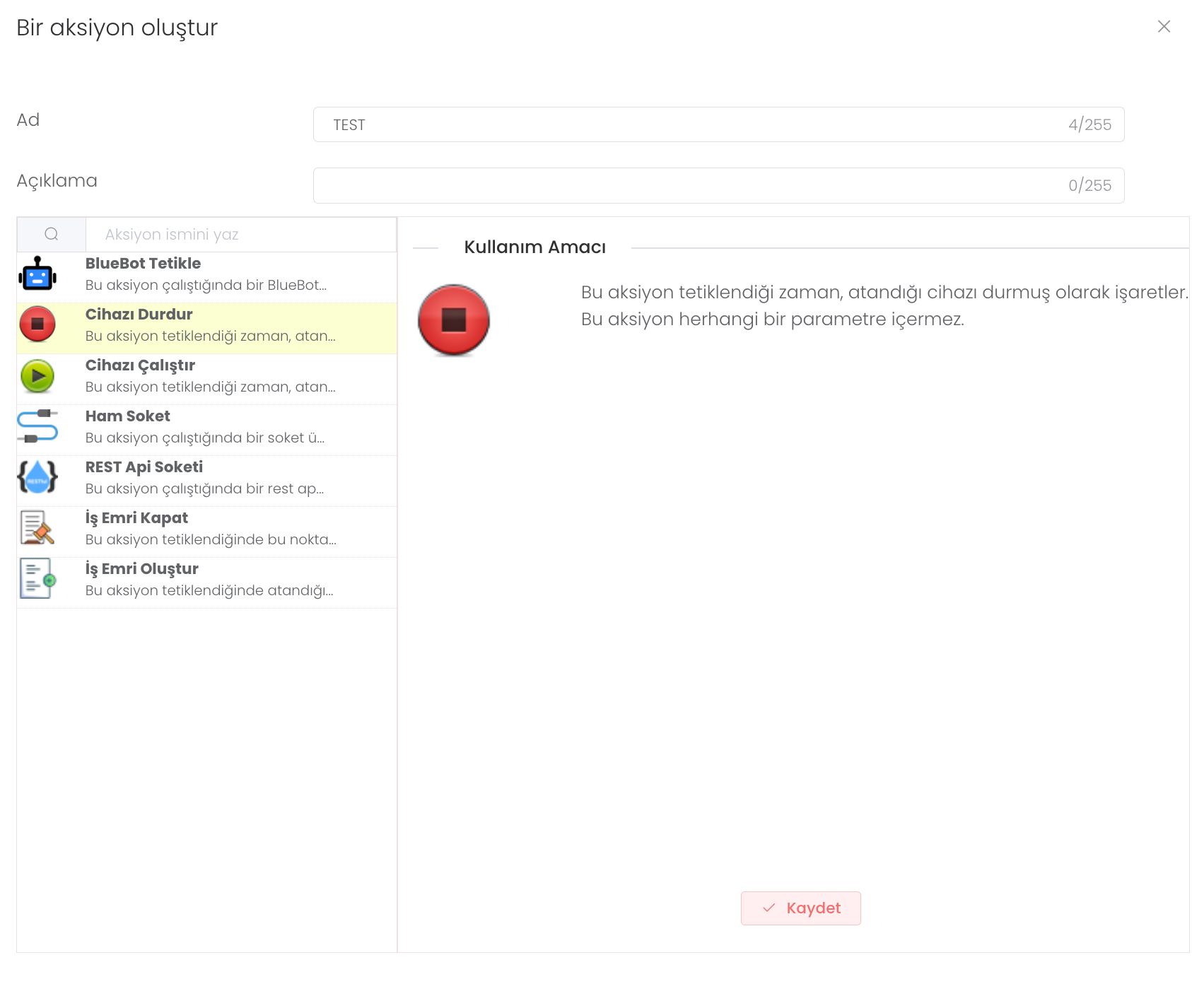 Cihazı Durdur: Bu aksiyon tetiklendiği zaman, atandığı cihazı durmuş olarak işaretler. Bu aksiyon herhangi bir parametre içermez.