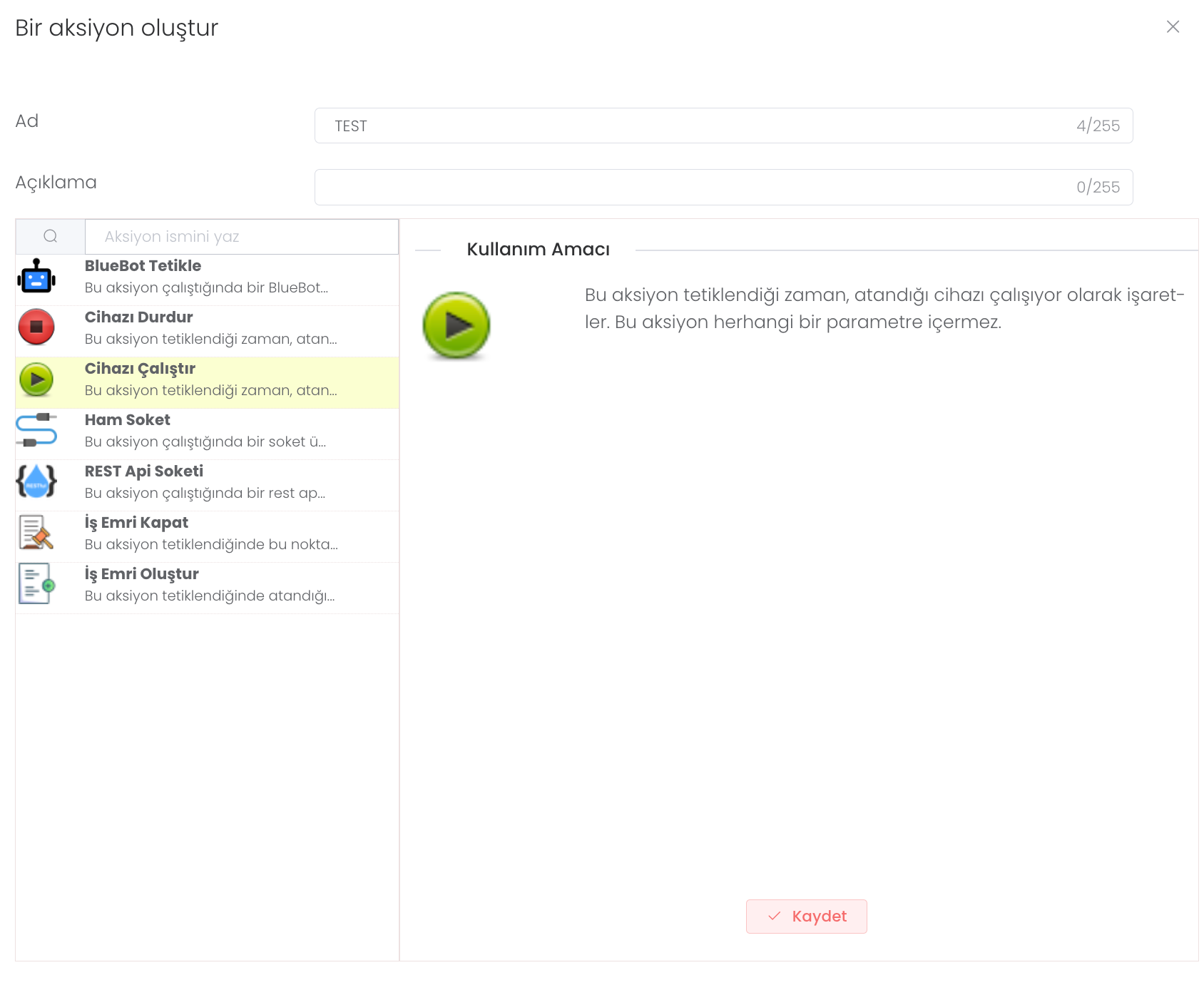 Cihazı Çalıştır: Bu aksiyon tetiklendiği zaman, atandığı cihazı çalışıyor olarak işaretler. Bu aksiyon herhangi bir parametre içermez.