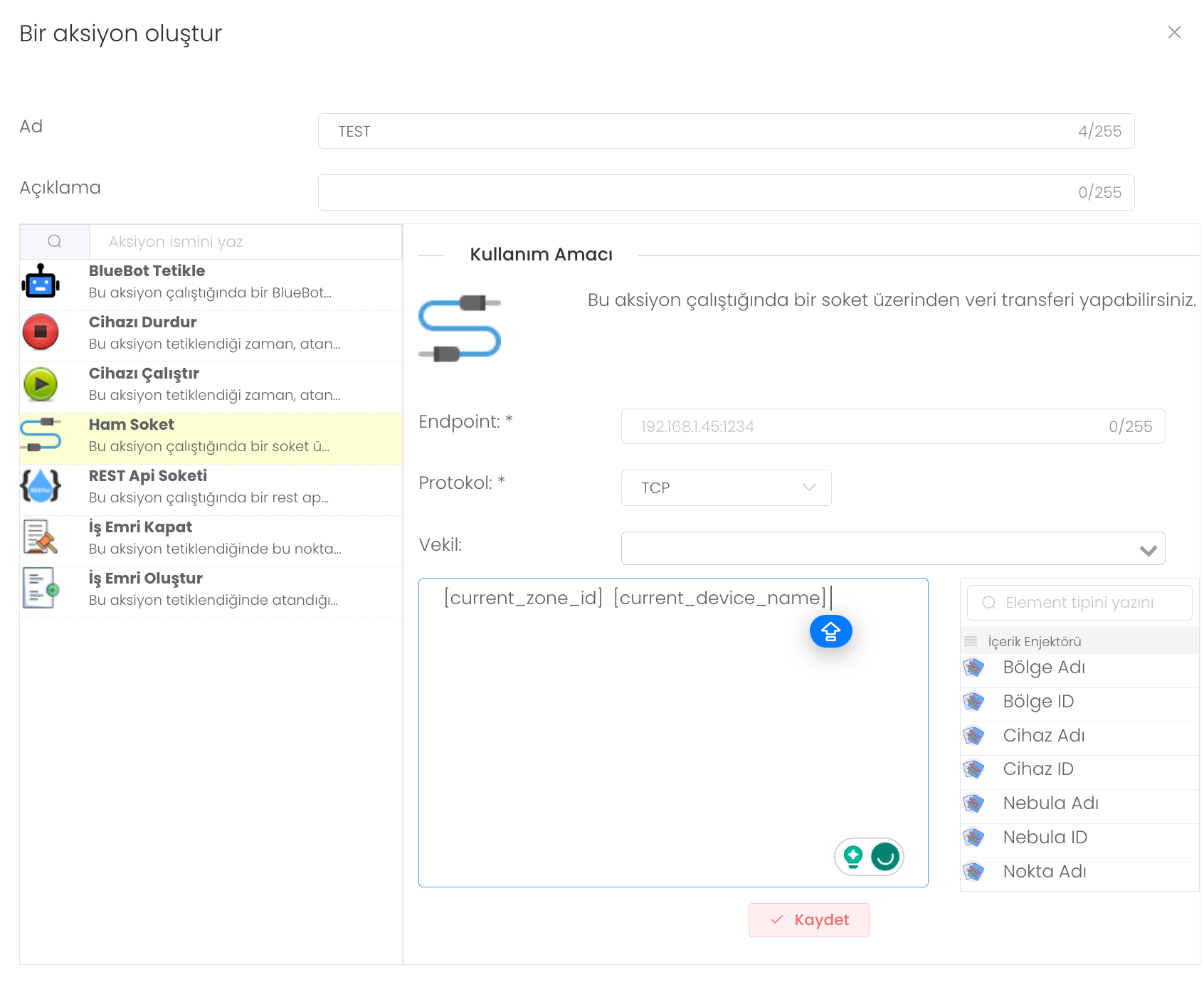 Ham Soket: Bu aksiyon çalıştığında bir soket üzerinden veri transferi yapabilirsiniz.