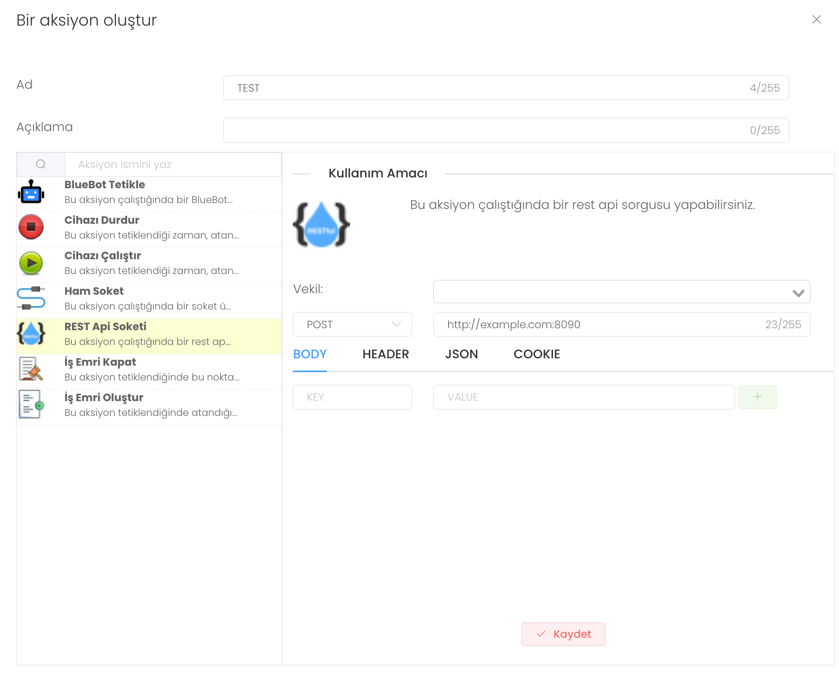 REST Api Soketi: Bu aksiyon çalıştığında bir rest api sorgusu yapabilirsiniz.