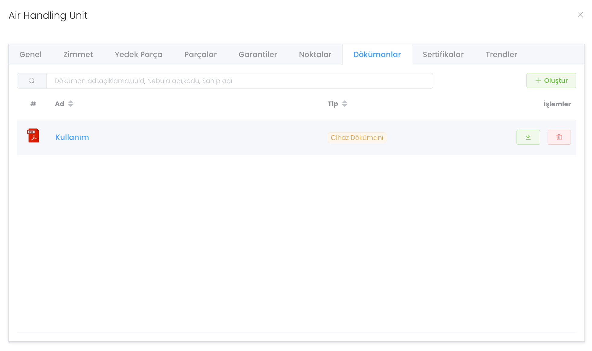 "Dökümanlar" bölümünde cihazın noktalarını görebileceğiniz, yönetebileceğiniz ve gerektiğinde dosya olarak indirebileceğiniz yapıdır. "Oluştur" butonu ile yeni döküman oluşturabilirisiniz.