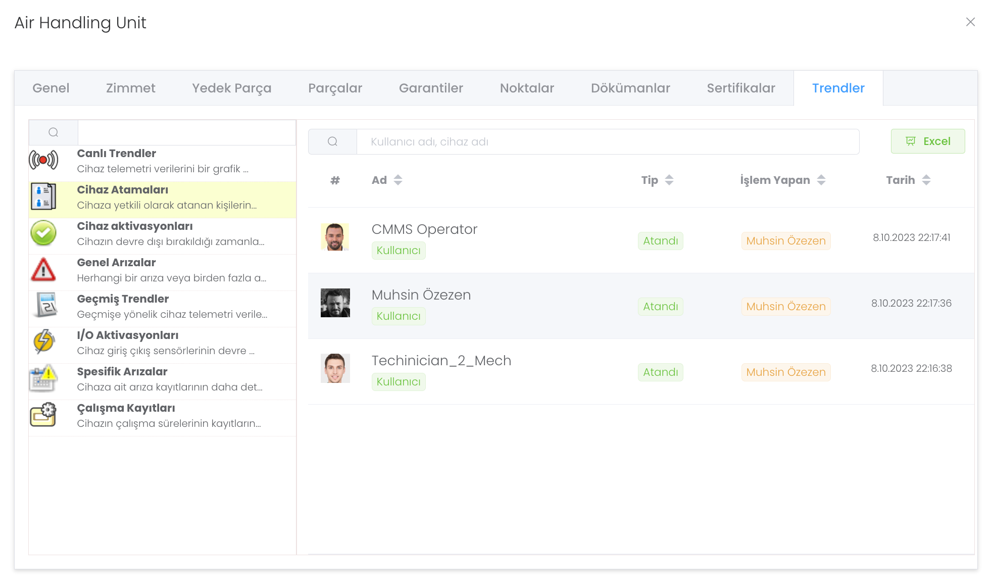 Cihaz Atamaları : Cihaza yetkili olarak atanan kişilerin kayıtlarını incelemenizi sağlar.
