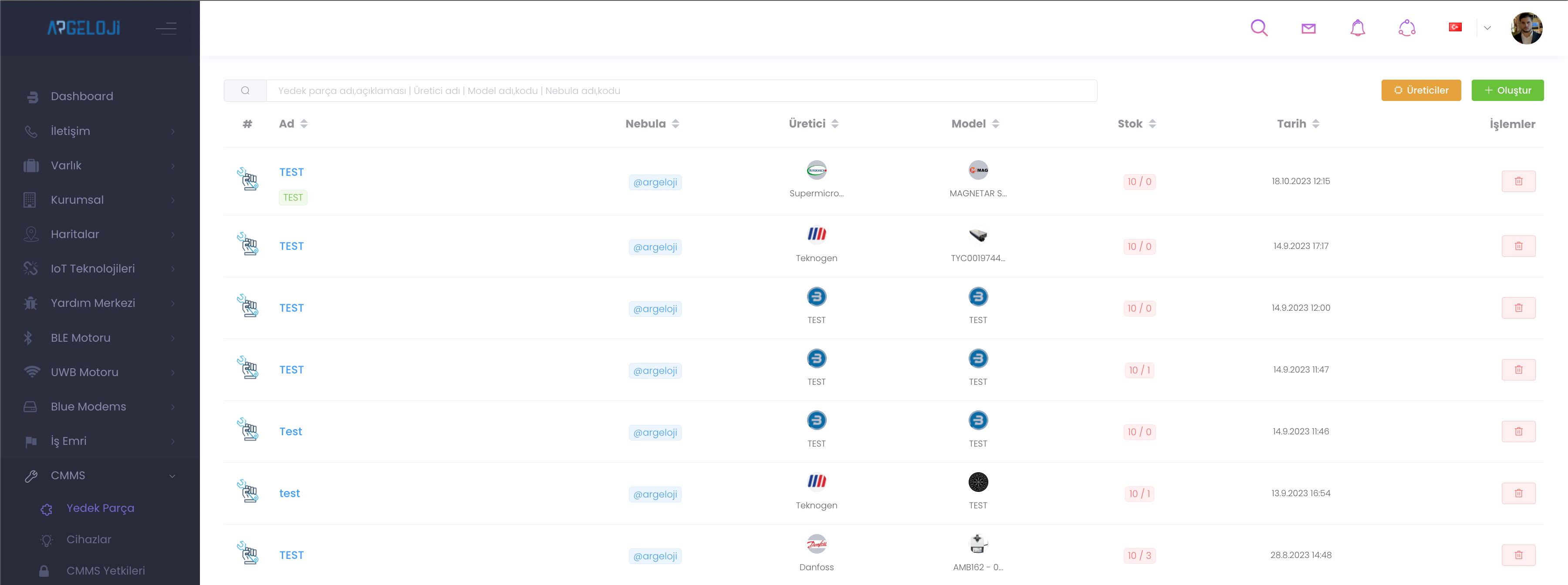 CMMS, yedek parça, cihazların yönetildiği paneldir. "Yedek Parça" panelinde tüm parçalarının üretici, model, stok durumu vb. yönetimini sağladığınız yerdir.