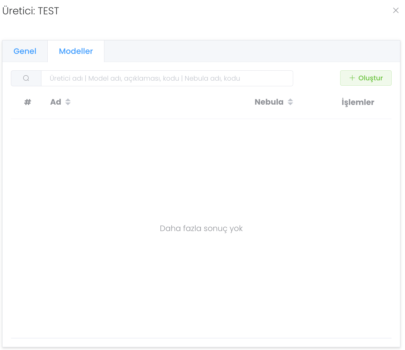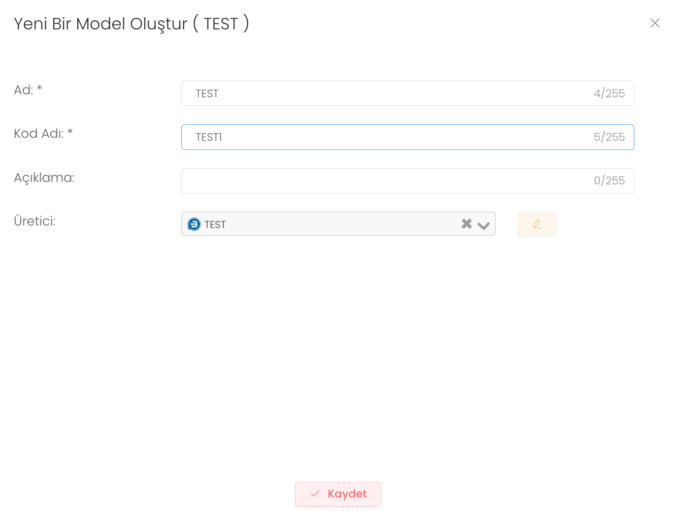 "Oluştur" butonuna bastıktan ve ad, kod adı, açıklama, üretici gibi bilgileri girdikten sonra yeni model oluşumunuzu tamamlamış olursunuz.