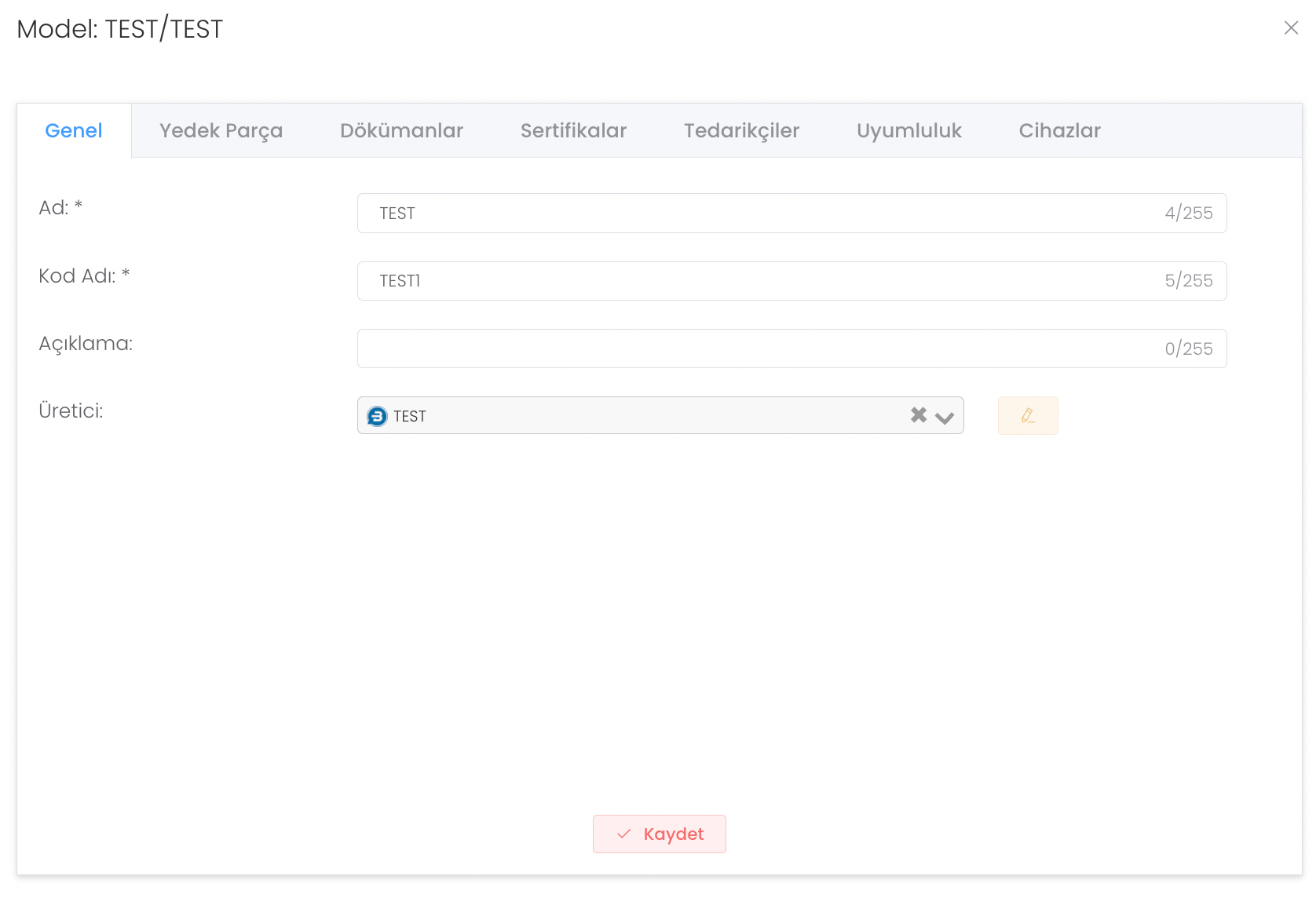 "Oluştur" butonuna bastıktan sonra ad, açıklama, üretici, model vb. gibi bilgileri girip modelinize yedek parça tanımlayabilirsiniz.