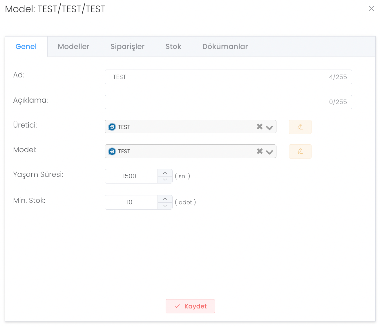 "Oluştur" butonuna bastığınızda yeni yedek parça oluşturmanız için size bir alan sunulur. Bu alana ad, açıklama, üretici bilgisi, model, yaşam süresi, minimum stok durumunu girdikten sonra "Kaydet" butonuna basınız. Yeni yedek parça oluşturdunuz.