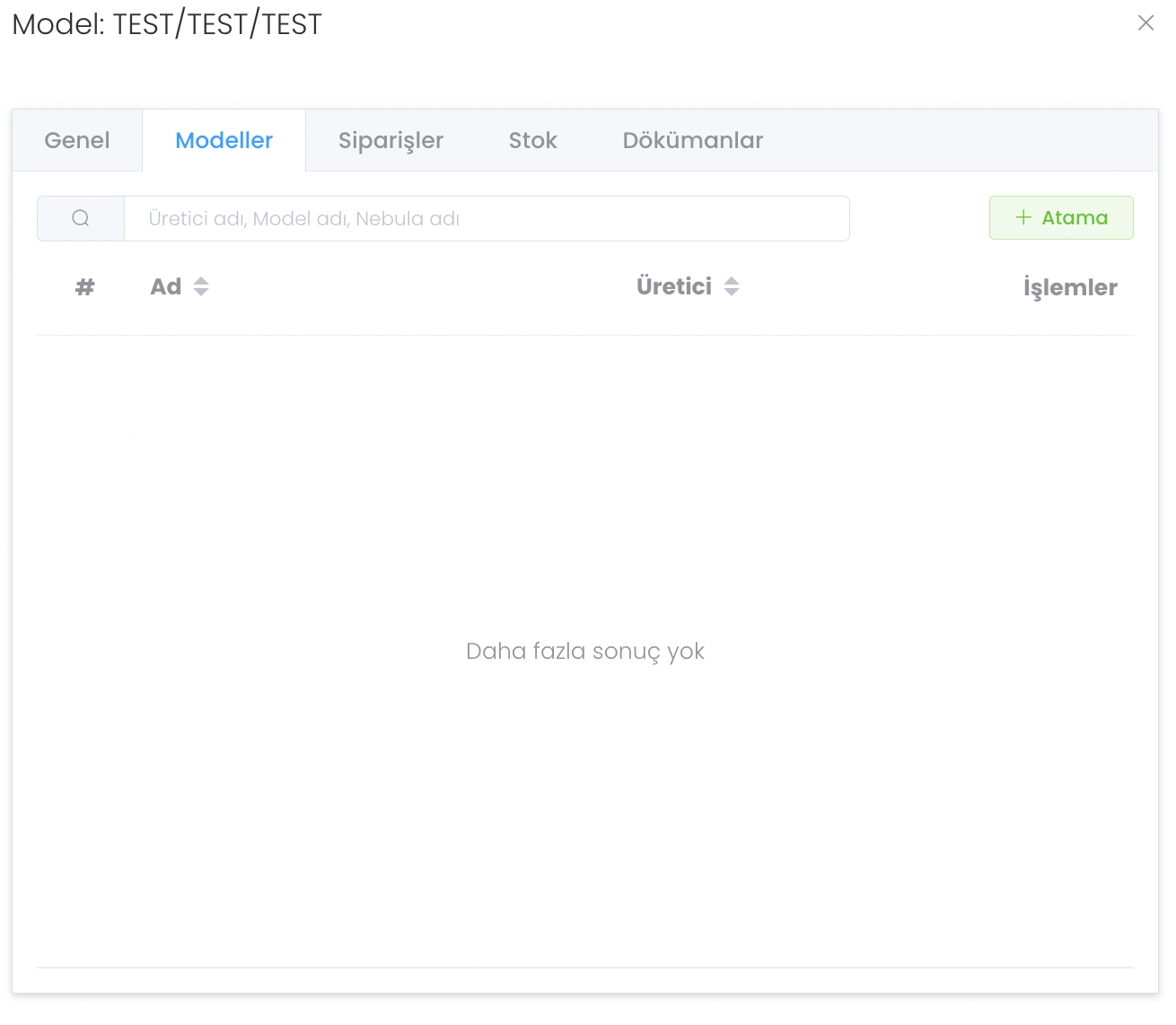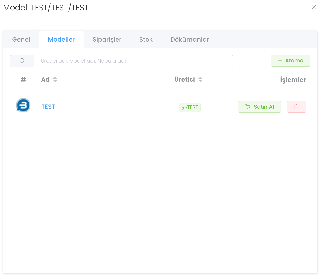 "Tedarikçiler" bölümünde modele atanmış tedarikçileri görür ve yönetirsiniz. Modele yeni tedarikçi atamak için ise "Atama" butonuna tıklayınız.
