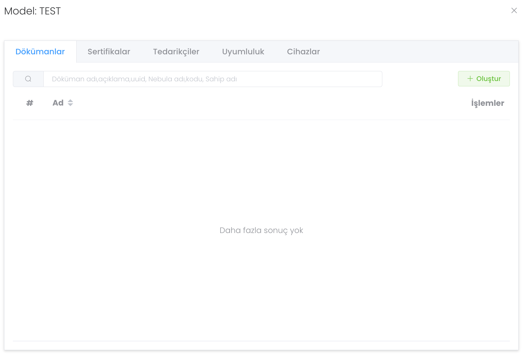 Dökümanlar bölümünde modele tanımlanmış dökümanları görür ihtiyaç halinde indirme iconu içeren yeşil butona bastığınız takdirde indirme sağlayabilirsiniz. Yeni döküman oluşturmak için ise "Oluştur" butonuna tıklayınız.