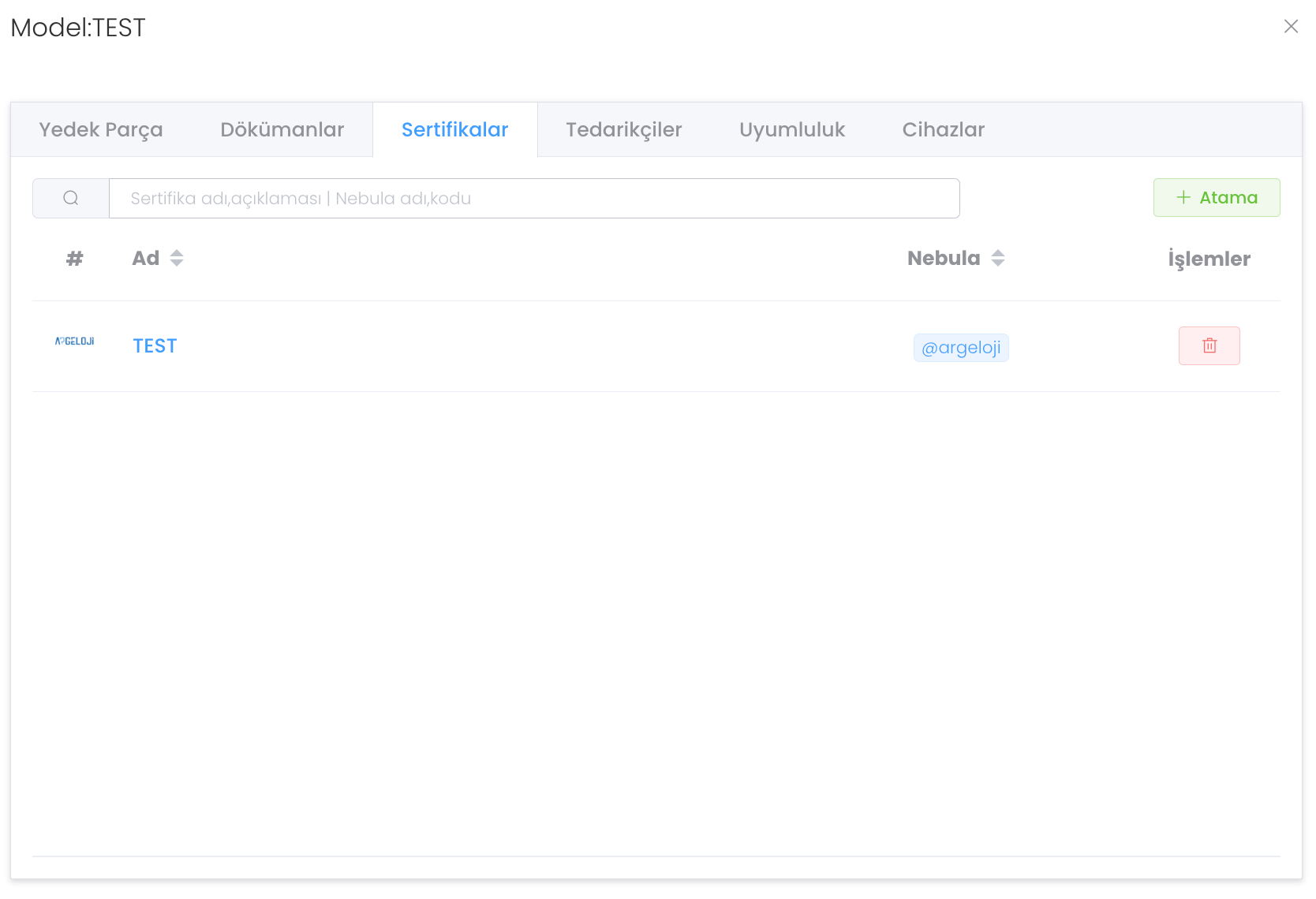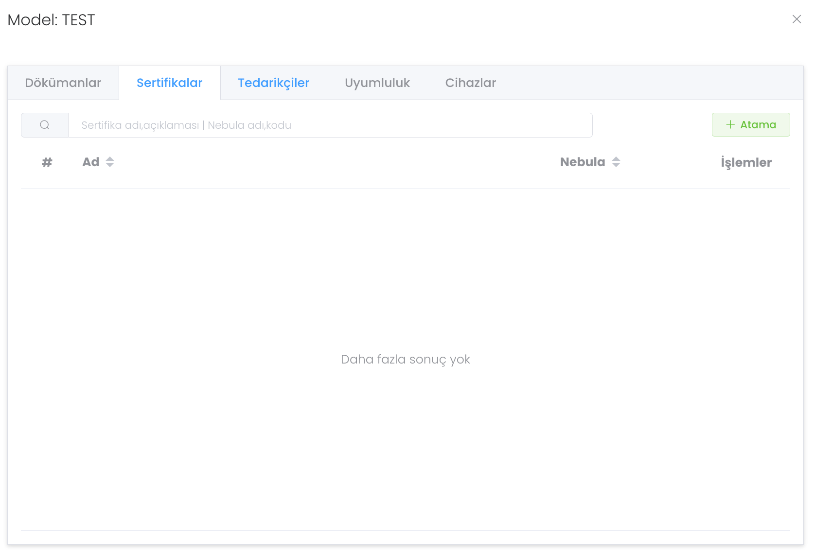 "Sertifikalar" bölümünde modele atanmış Sertifikaları görür ve yönetirsiniz. Modele yeni sertifika atamak için ise "Atama" butonuna tıklayınız.
