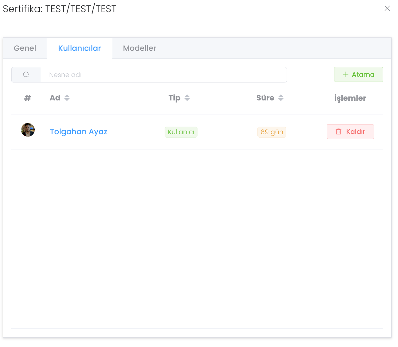 "Kullanıcılar" bölümünde sertifikaya sahip kullanıcıları görüntüleyip yönetebilirsiniz. Kullanıcı eklemek isterseniz "Atama" butonuna tıklayıp sertifikaya yeni kullanıcı ekleyebilirsiniz.