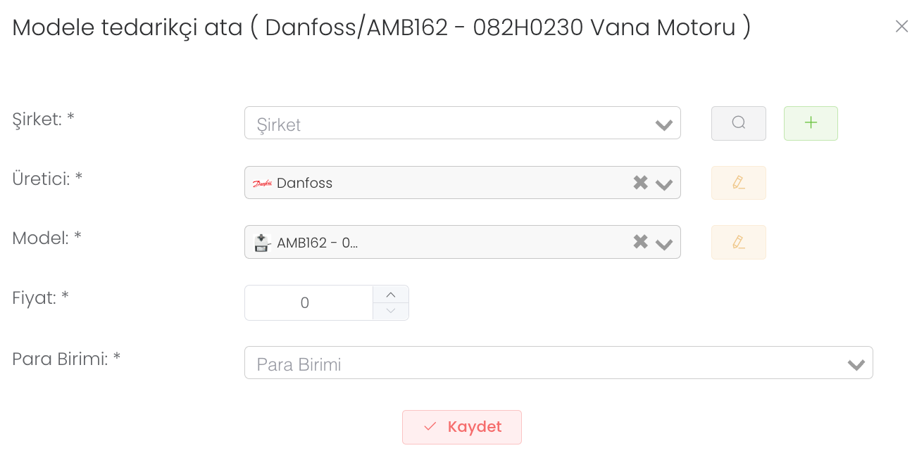 "Atama" butonuna tıkladıktan sonra şirket, üretici, model, fiyat, para birimi bilgisi girip "Kaydet" butonuna basmanız yeterli . Böylece yeni tedarikçi atamış olursunuz.