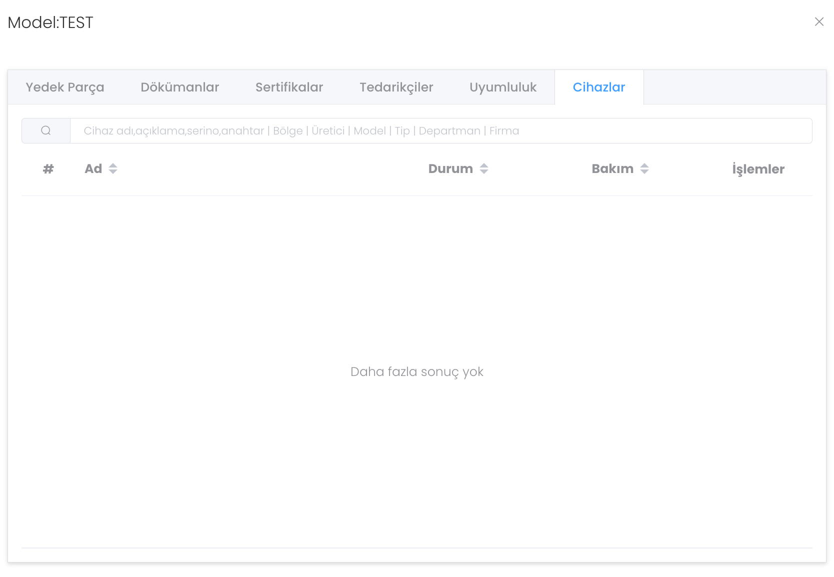 "Cihazlar" bölümünde modele tanımlı cihazları görür ve yönetirsiniz.