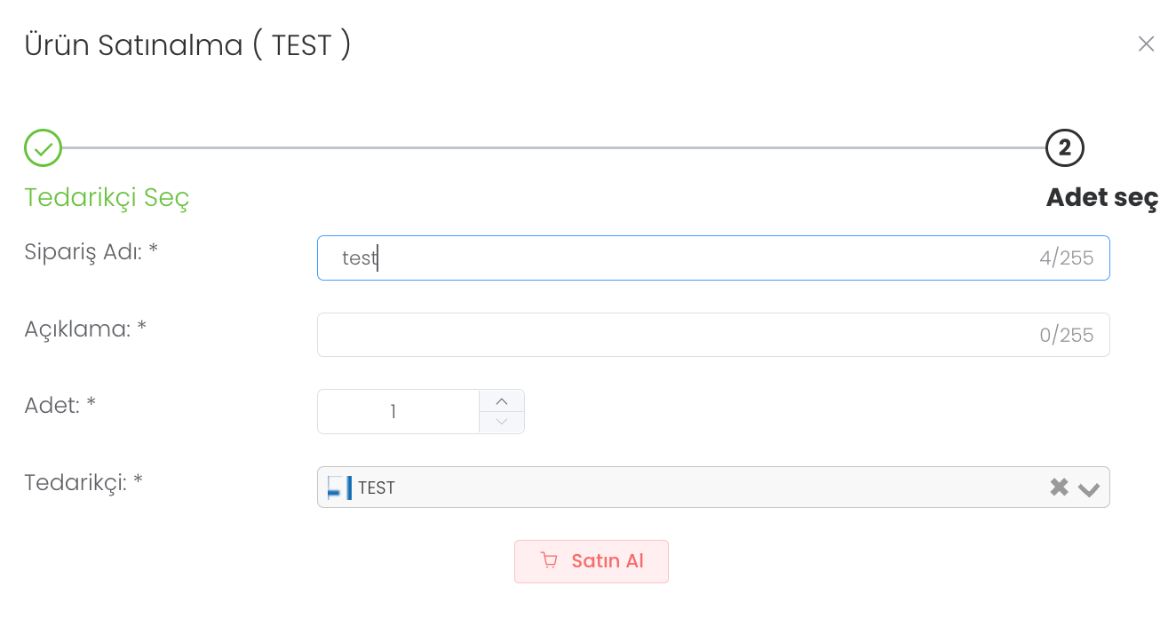 Sipariş adı, adet, tedarikçi girdikten sonra "Satın Al" butonuna tıklayınız.